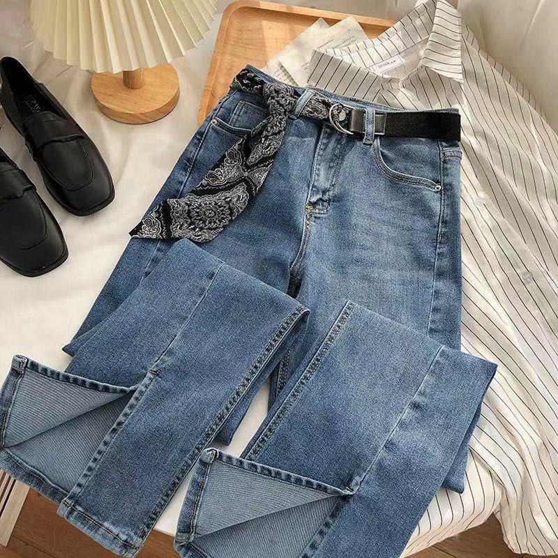 网红百搭裤脚开叉高腰弹力牛仔裤女学生新款微喇叭阔腿长裤夏