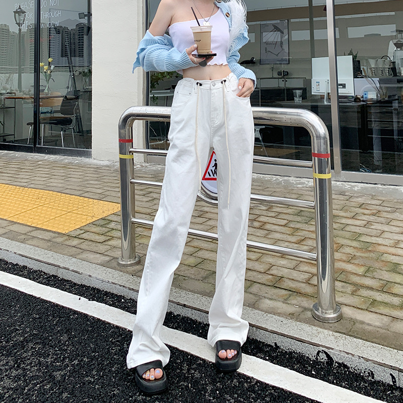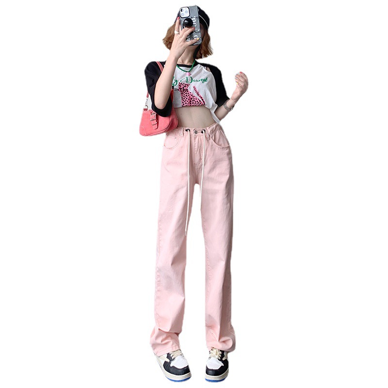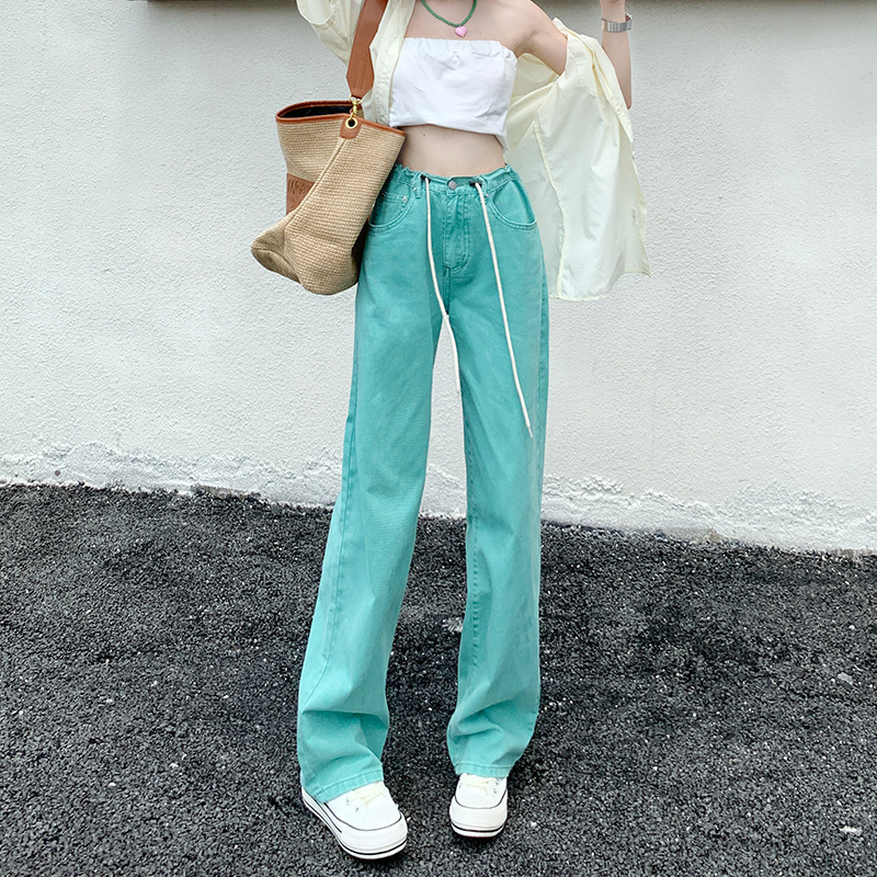 韩系抽绳休闲牛仔裤女春季年新款直筒宽松显瘦彩色阔腿拖地裤