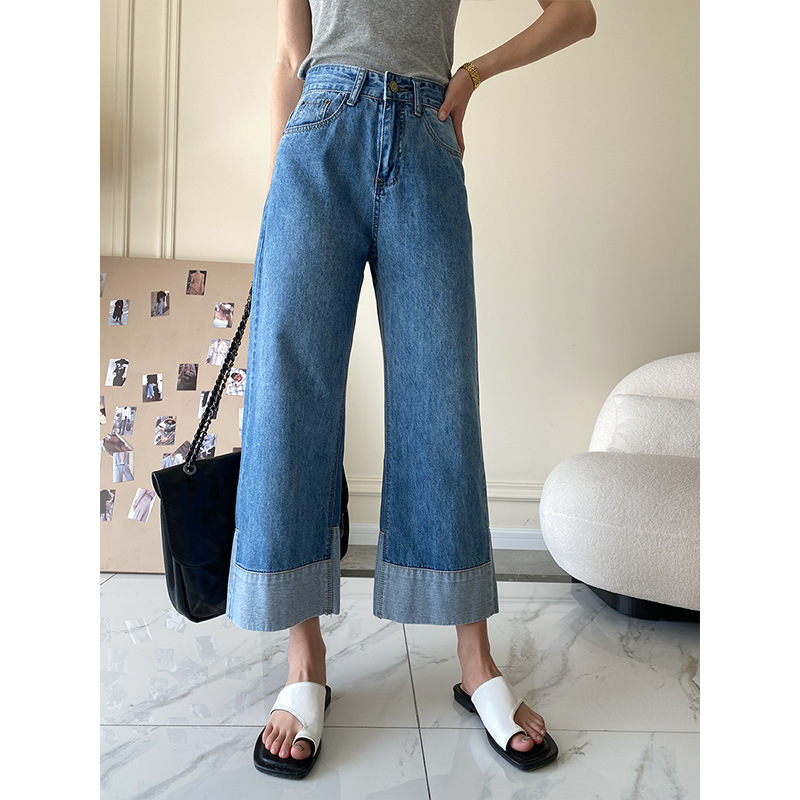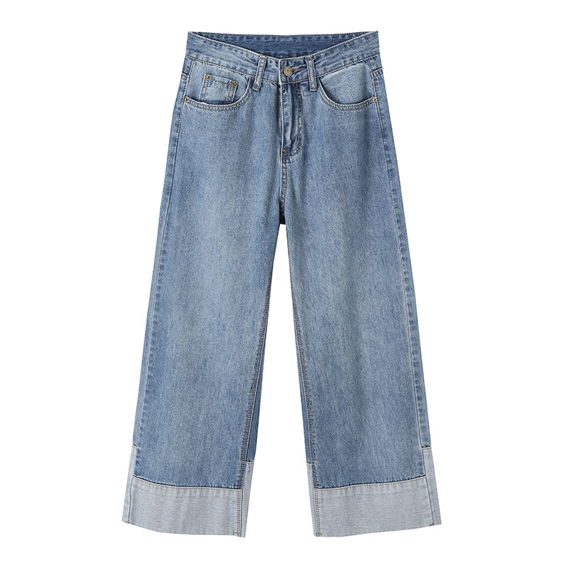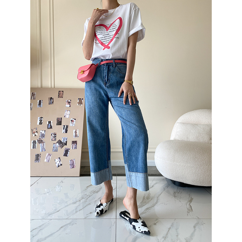 司南 时髦撞色卷边九分高腰直筒显瘦牛仔裤早春新款 SN1384