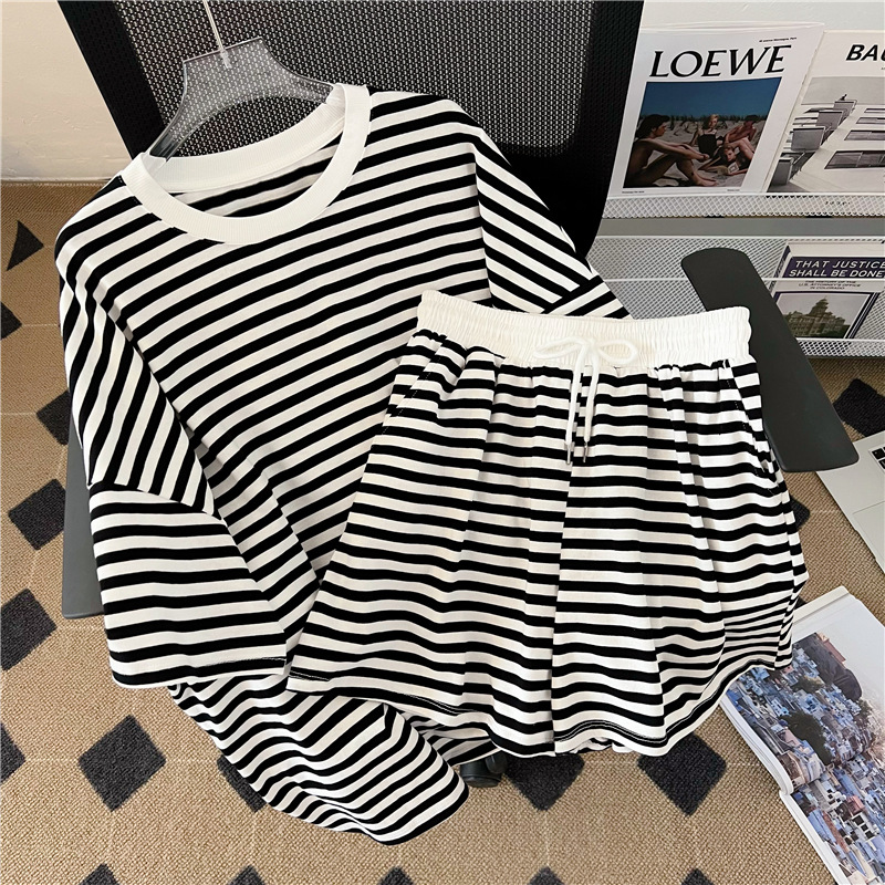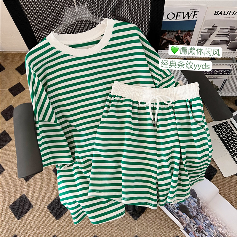 夏季韩版新款宽松学院风条纹短袖套装女时尚运动显瘦两件套潮