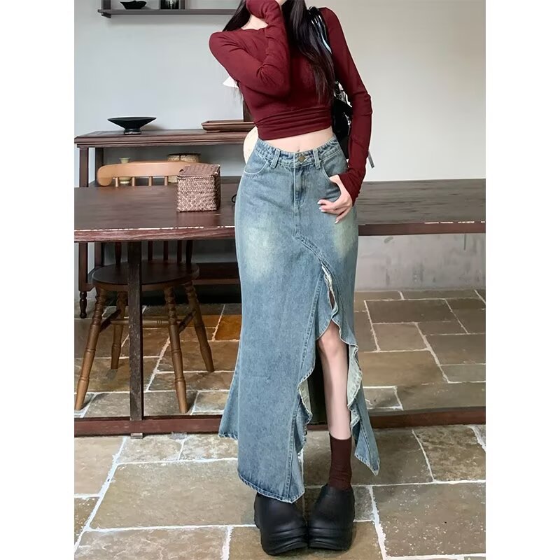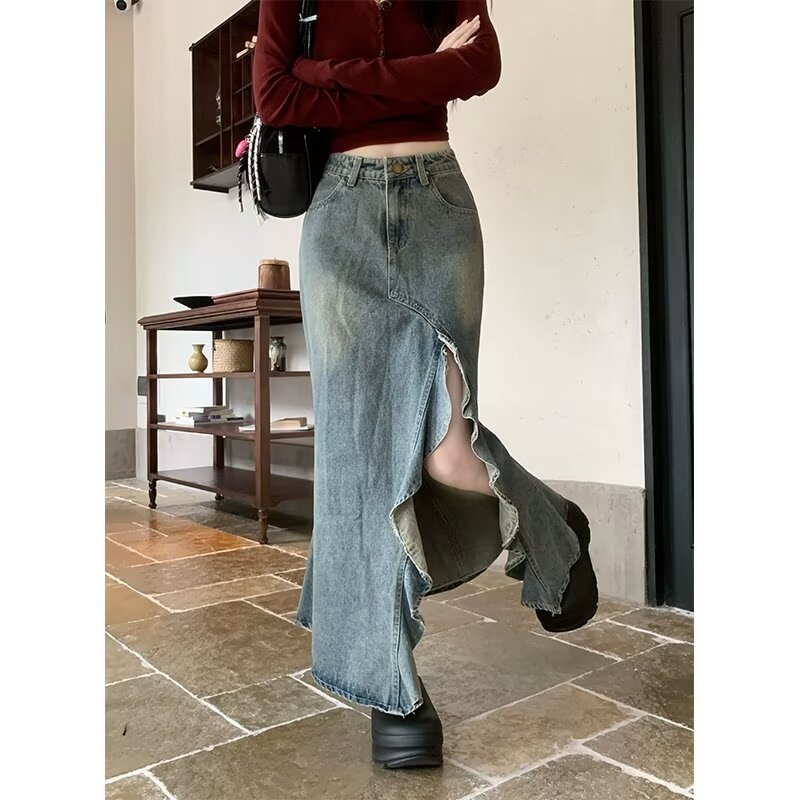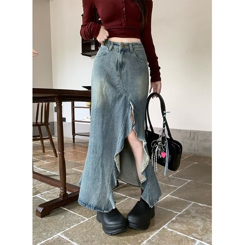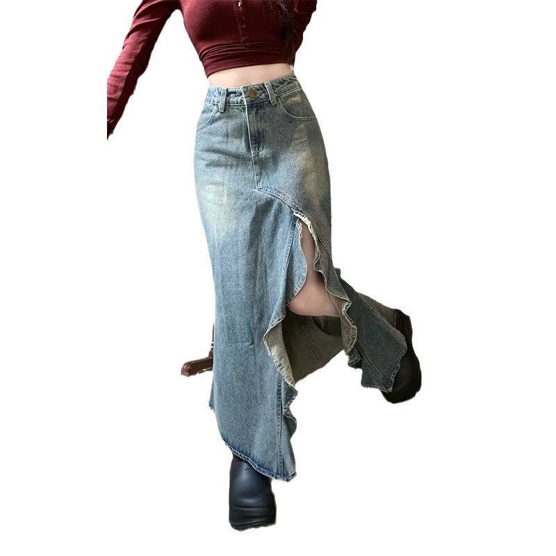 美式开叉牛仔半身裙女夏季辣妹高腰a字鱼尾裙不规则中长款包臀裙