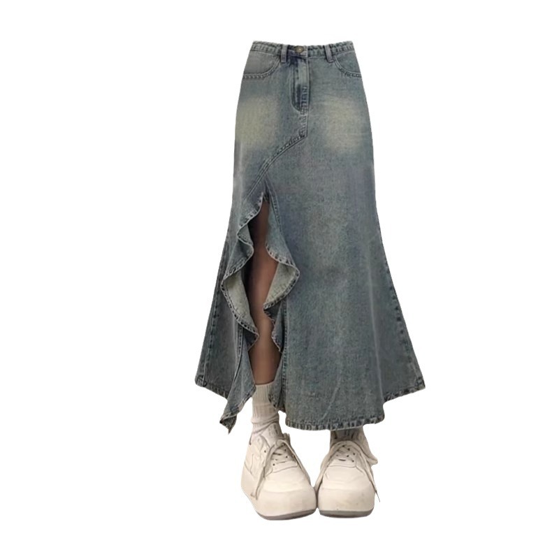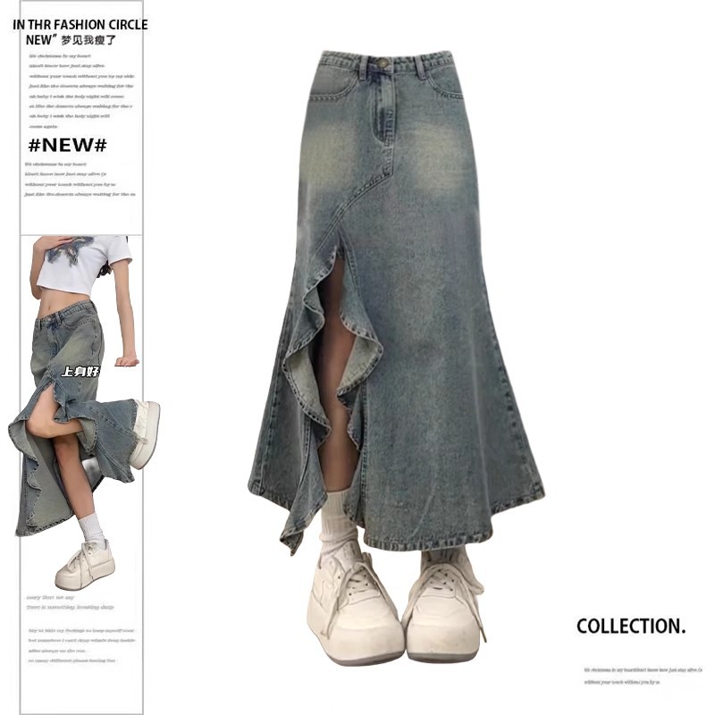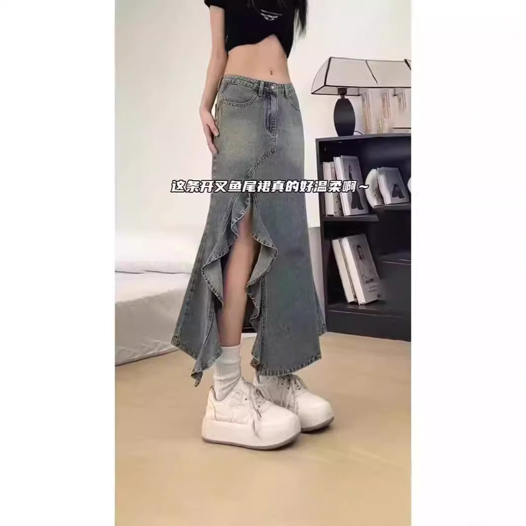 大码新款复古中长款牛仔半身裙女设计感波浪开叉高腰鱼尾裙子