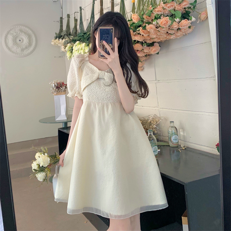法式复古设计感网纱拼接公主裙女夏季奶油黄甜美气质泡泡袖连衣裙