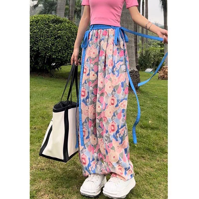 阔腿裤女新款夏季高腰印花设计垂坠感宽松百搭飘带扎染拖地裤