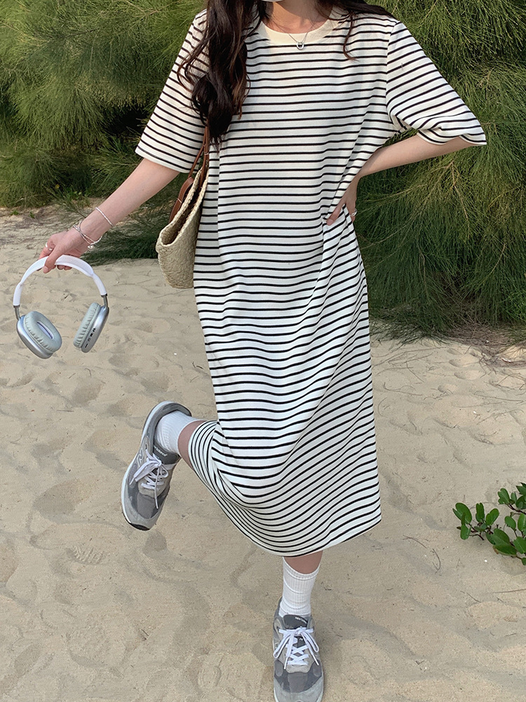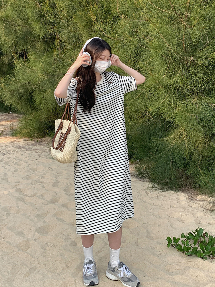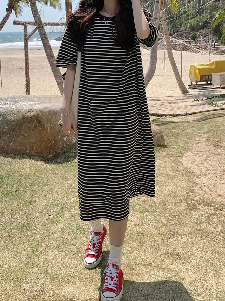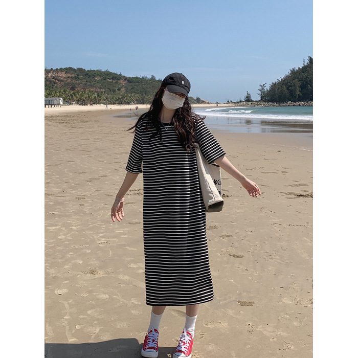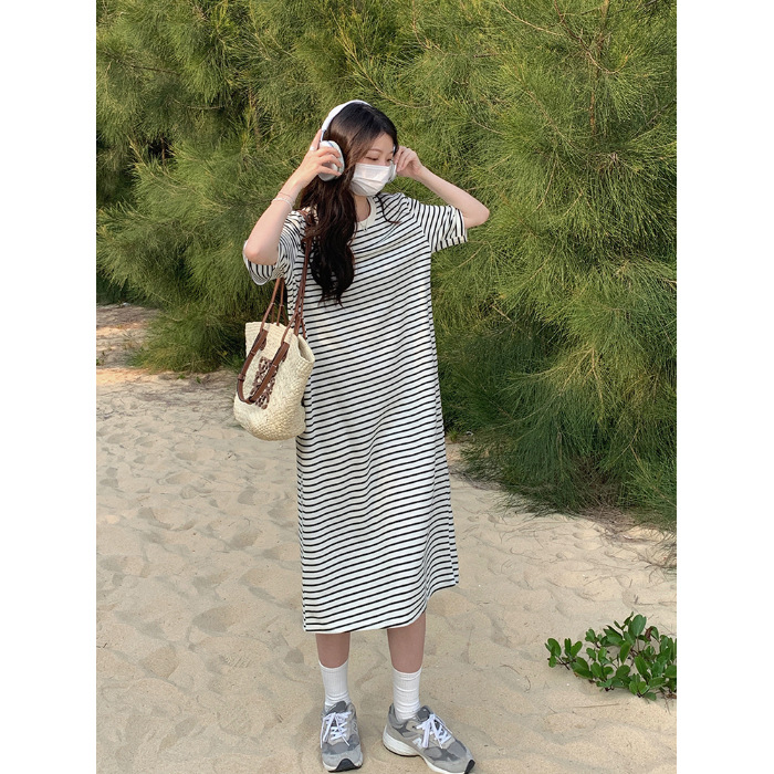欧美宽松大码女装夏季新款胖MM遮肉显瘦长裙女孕妇时尚洋气条纹裙
