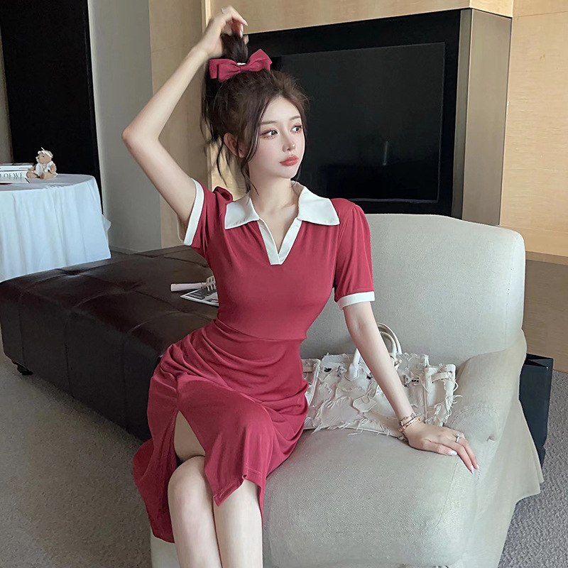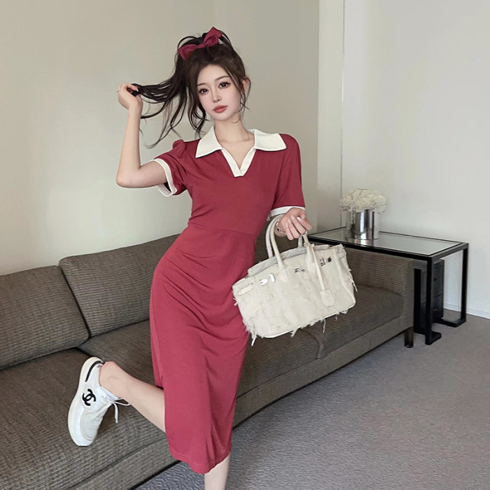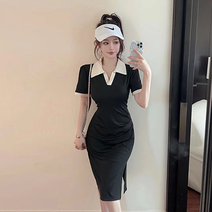 夏季新款收腰显瘦学院风Polo领连衣裙女设计感侧开叉气质优雅长裙
