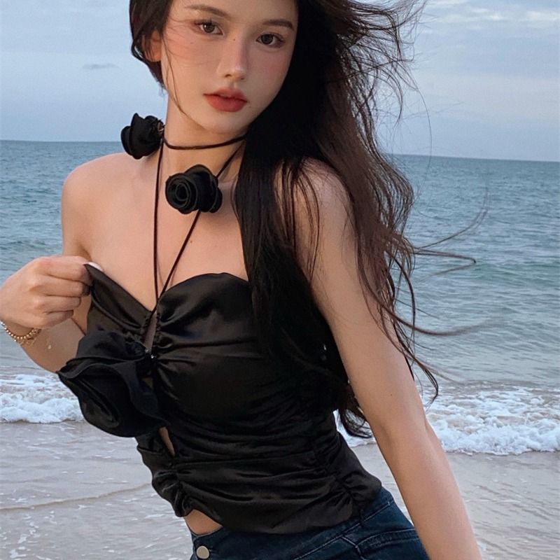 【月销10万】纯欲性感花朵挂颈小吊带背心夏内搭高腰短款辣妹上衣