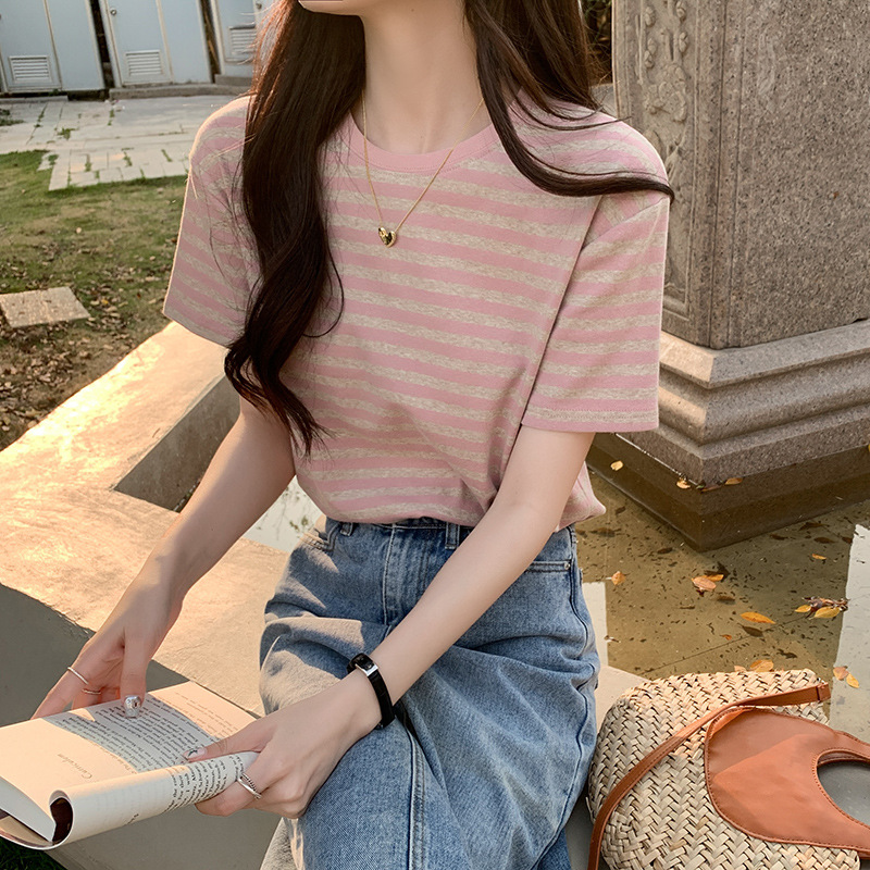 小清新条纹短袖t恤女夏季韩系宽松显瘦小个子圆领百搭半袖上衣服