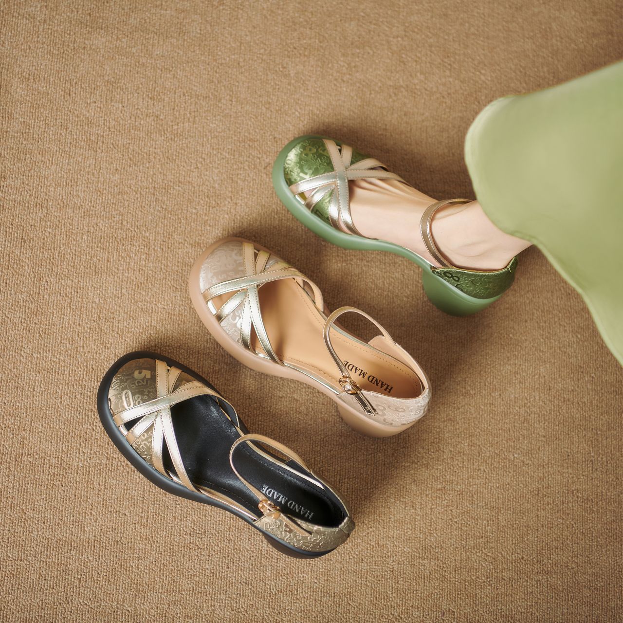 新中式粗跟包头凉鞋新款2025夏镂空编织细带软底罗马防水台高跟鞋