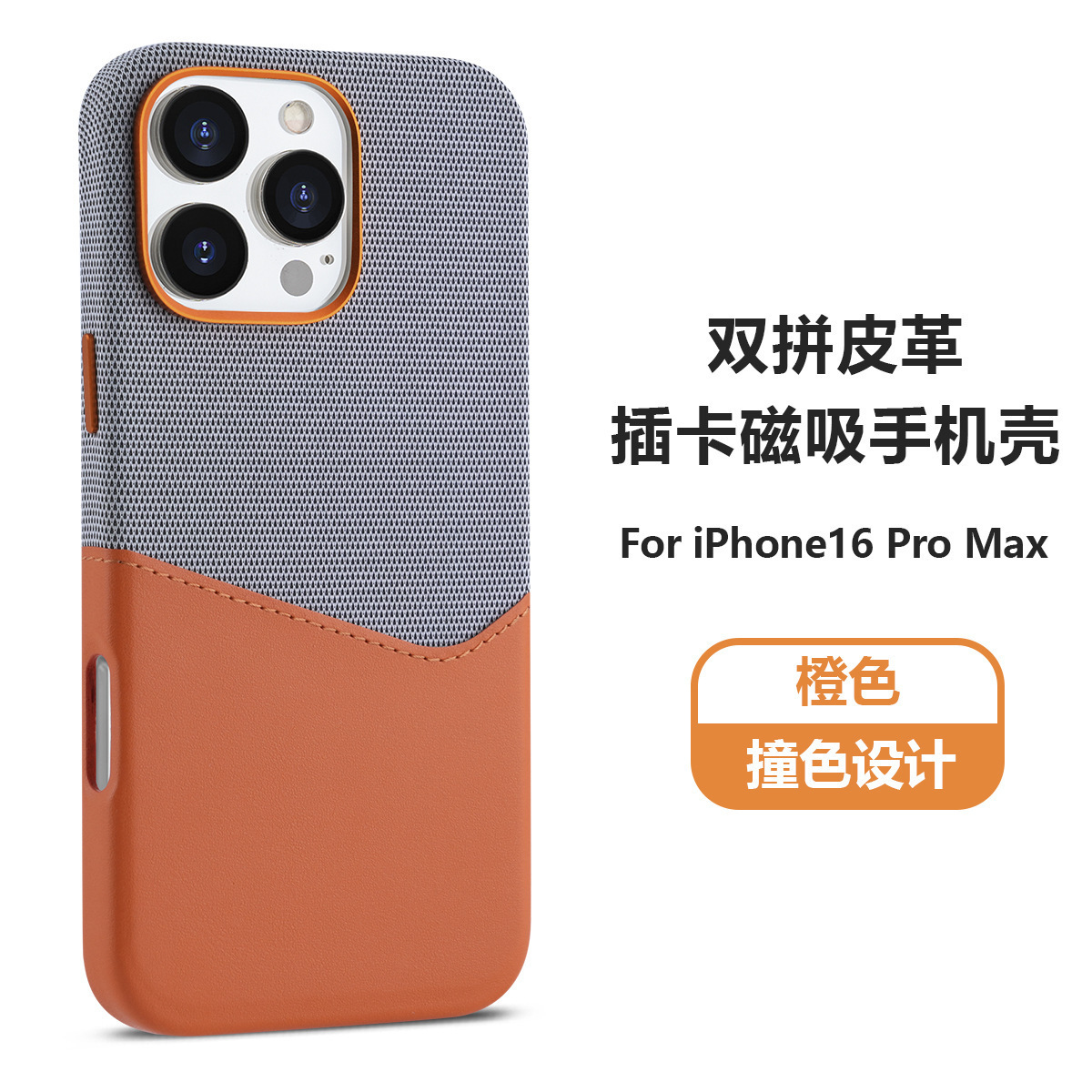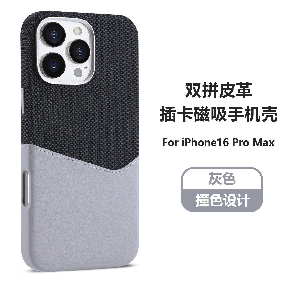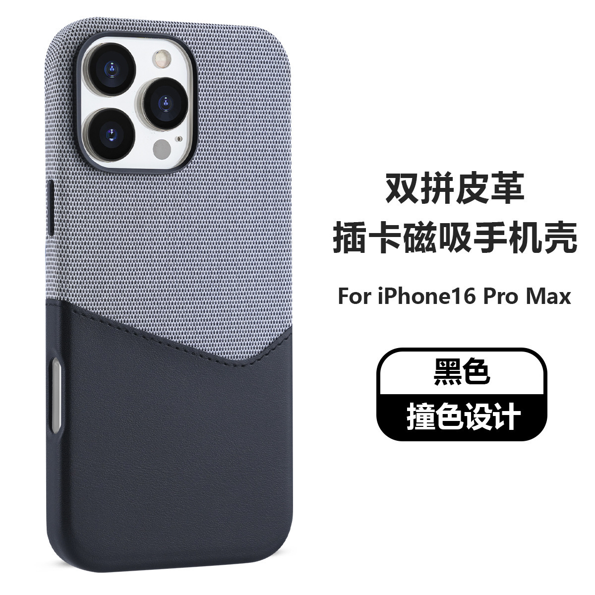 适用iPhone16布纹拼色手机壳磁吸皮革苹果15商务插卡多功能保护套
