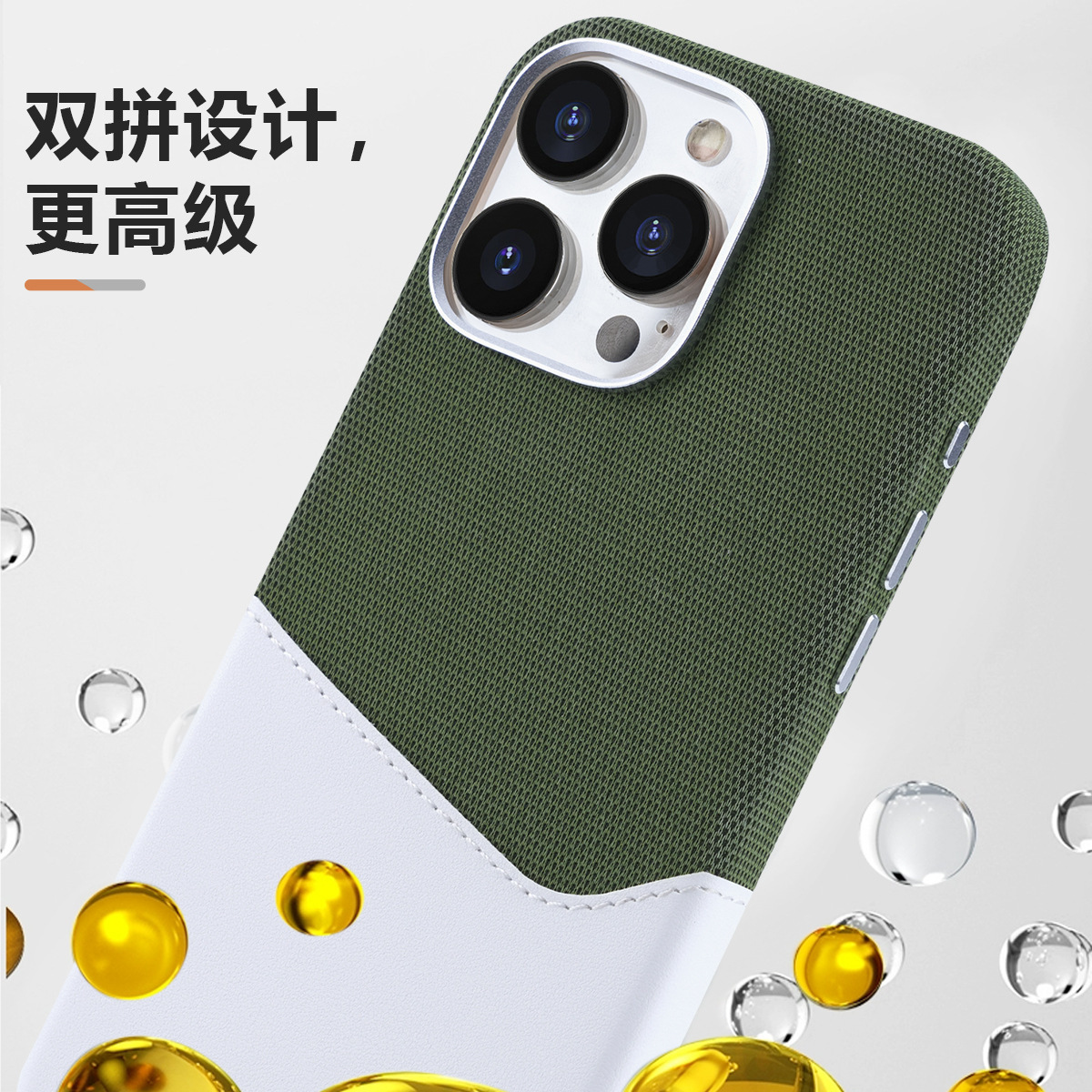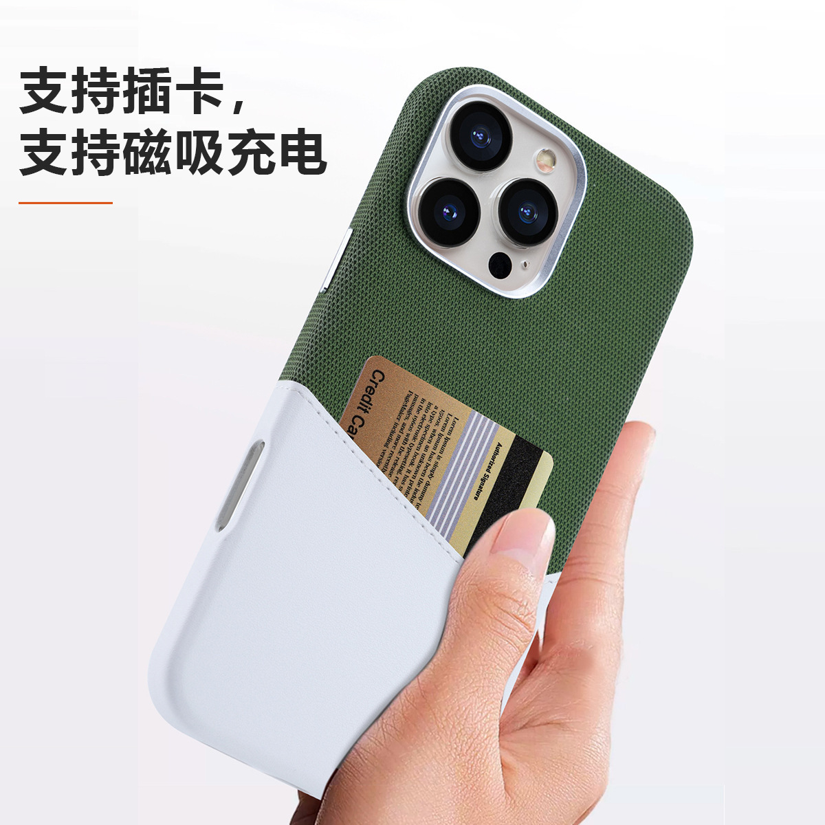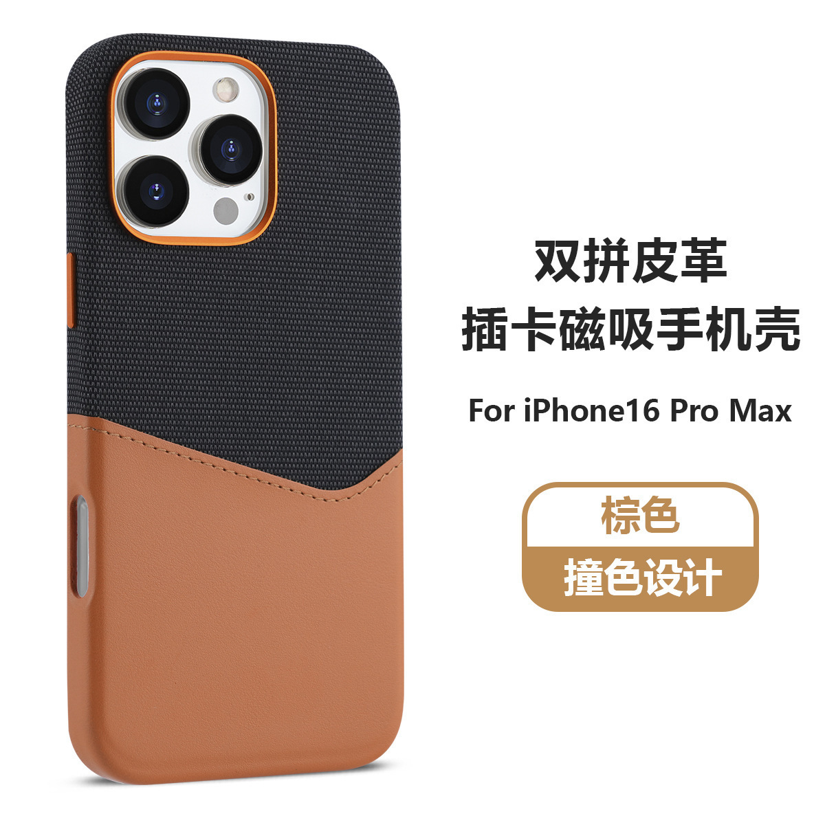 适用iPhone16布纹拼色手机壳磁吸皮革苹果15商务插卡多功能保护套