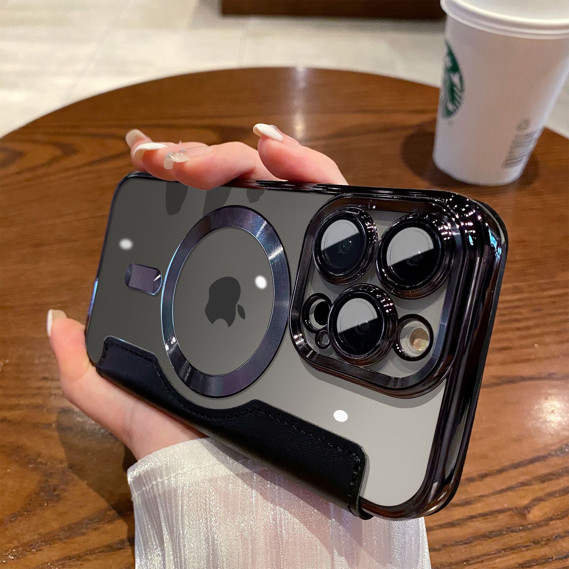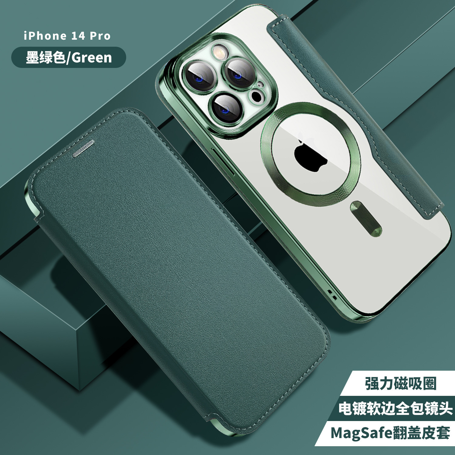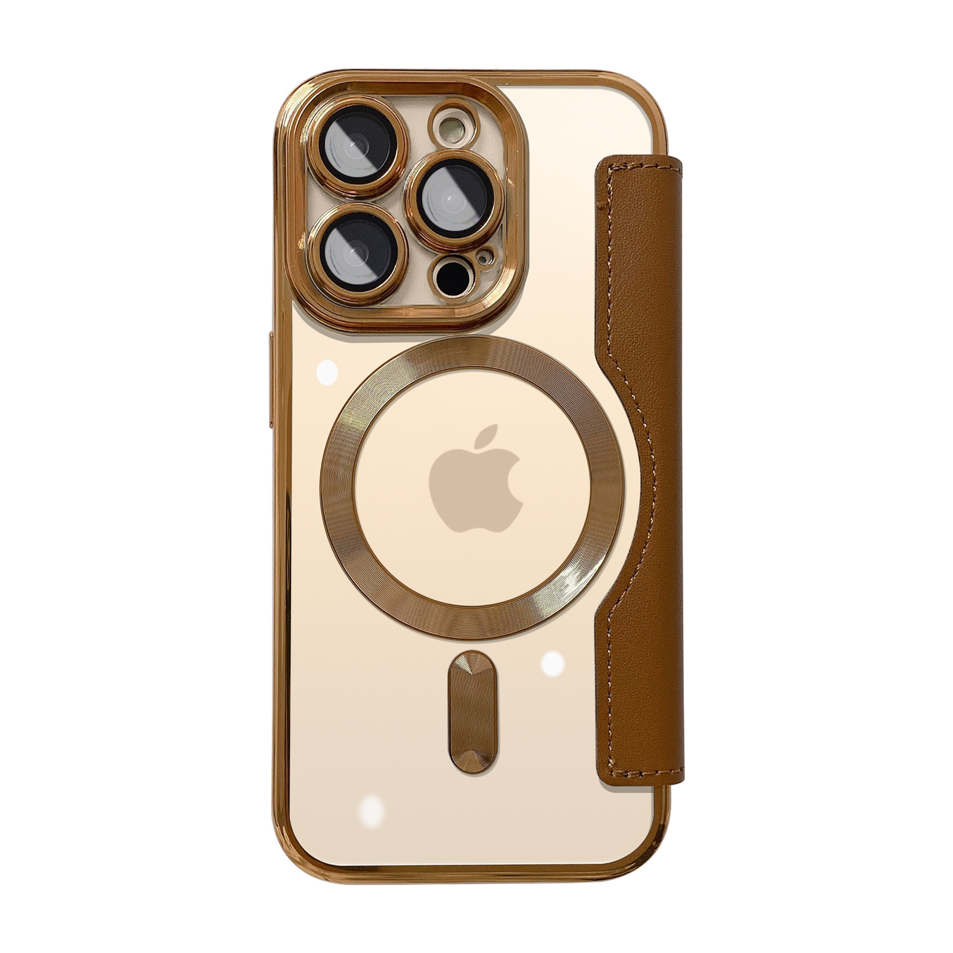 适用苹果16电镀金盾磁吸皮套手机壳iPhone14全包翻盖镜头膜保护套