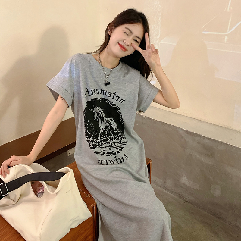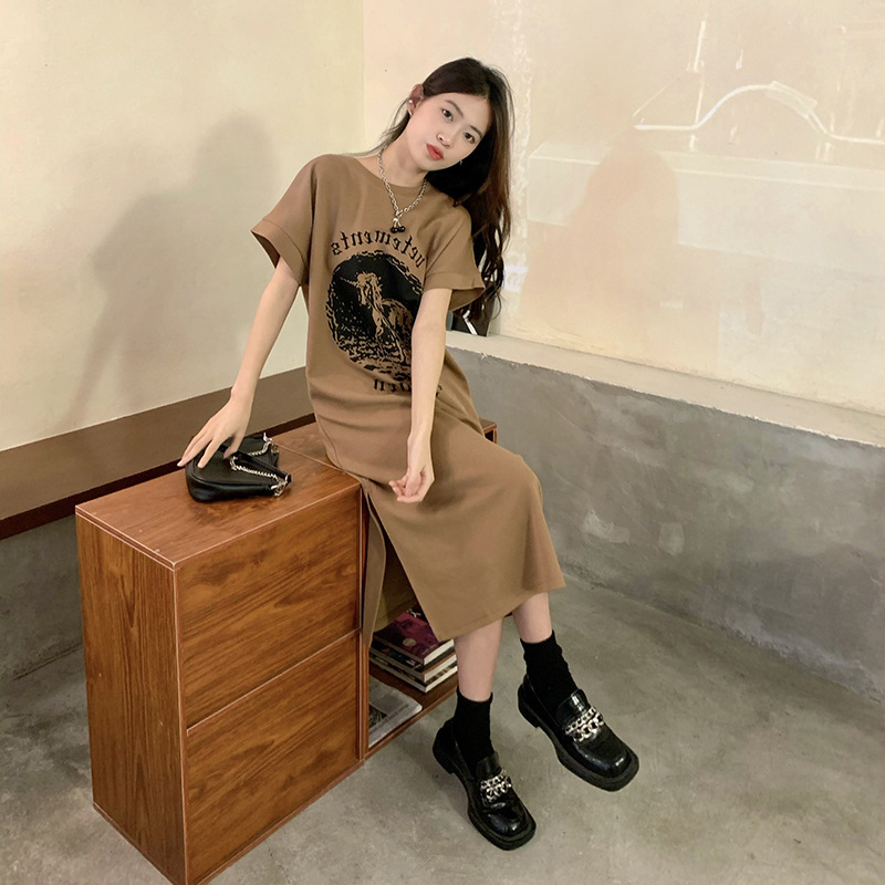 咖美棉斜纹抖音质量连衣裙女夏中长款短袖t恤裙圆领长裙大码女装