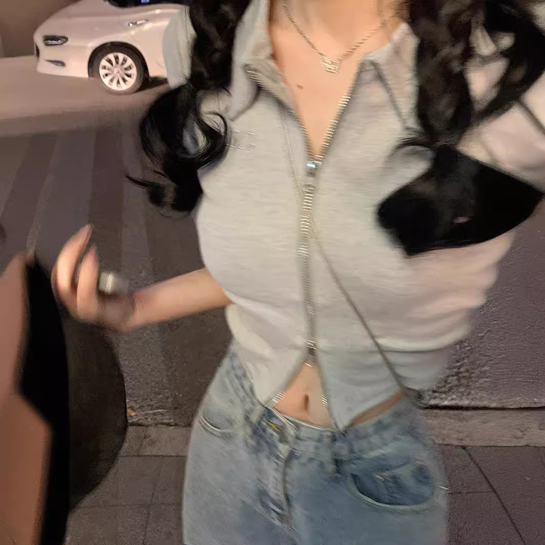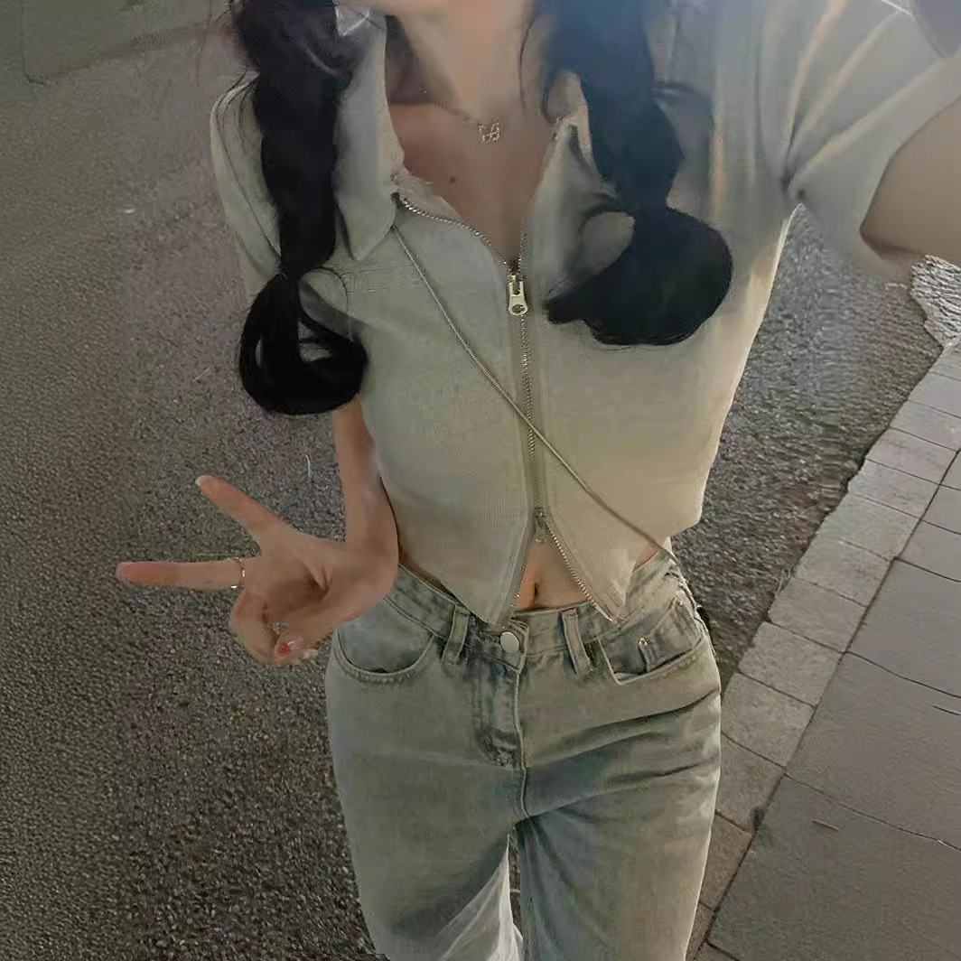 polo领l辣妹风夏设计感双拉链短袖T恤女小众设计感爆款上衣ins潮