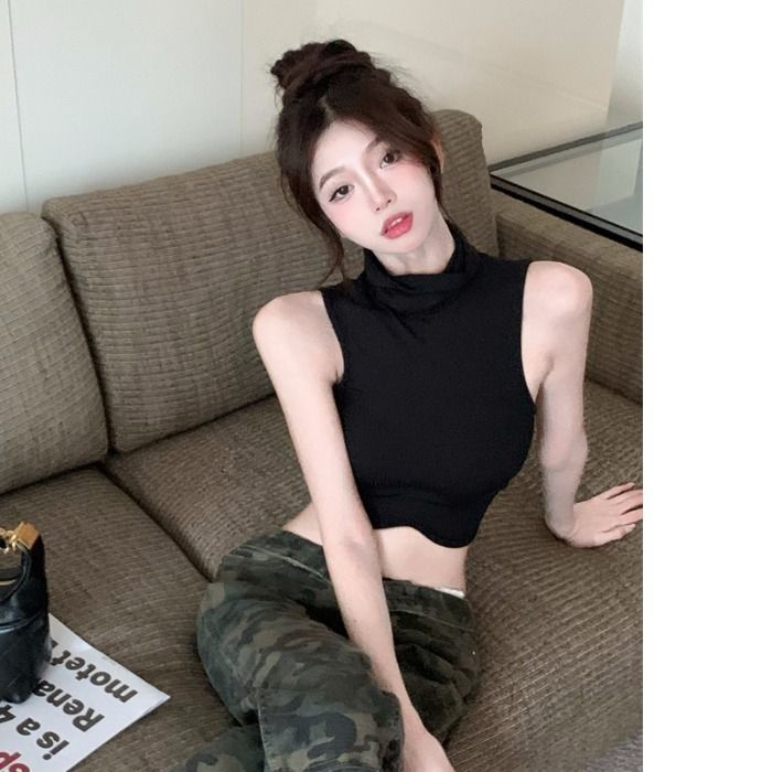 辣妹女夏季小众不规则纯欲短款露脐背心高领修身上衣