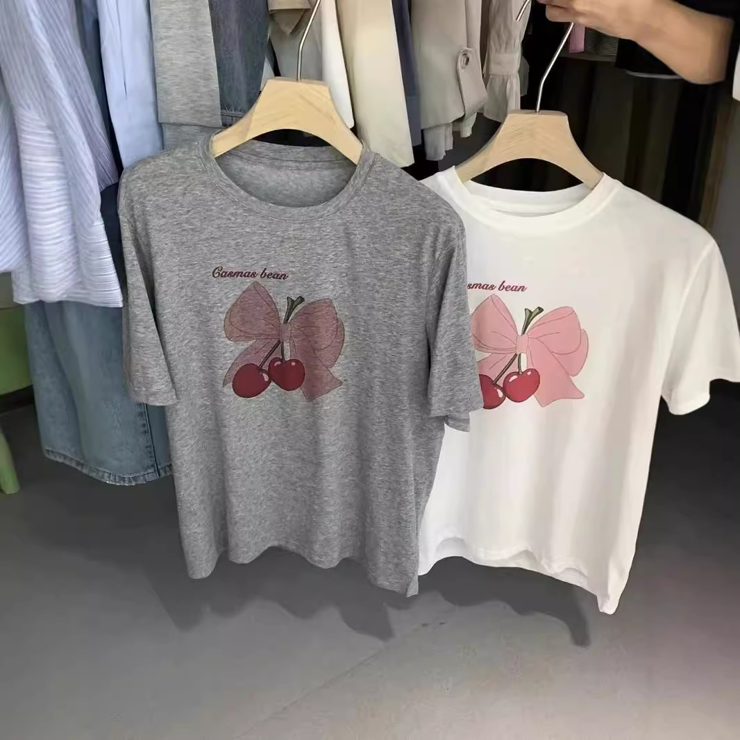 超手感莫代尔蝴蝶结樱桃印花白色短袖T恤女垂感薄款宽松体恤上衣