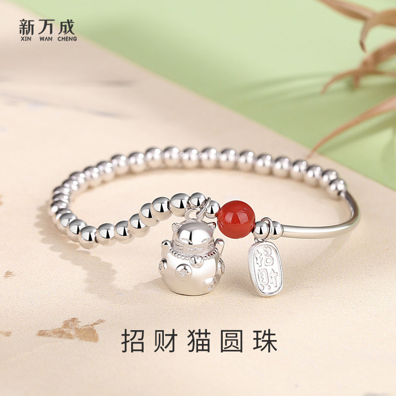 国潮s925纯银招财猫圆珠红玛瑙手链女新中式复古手环红玛瑙手饰品