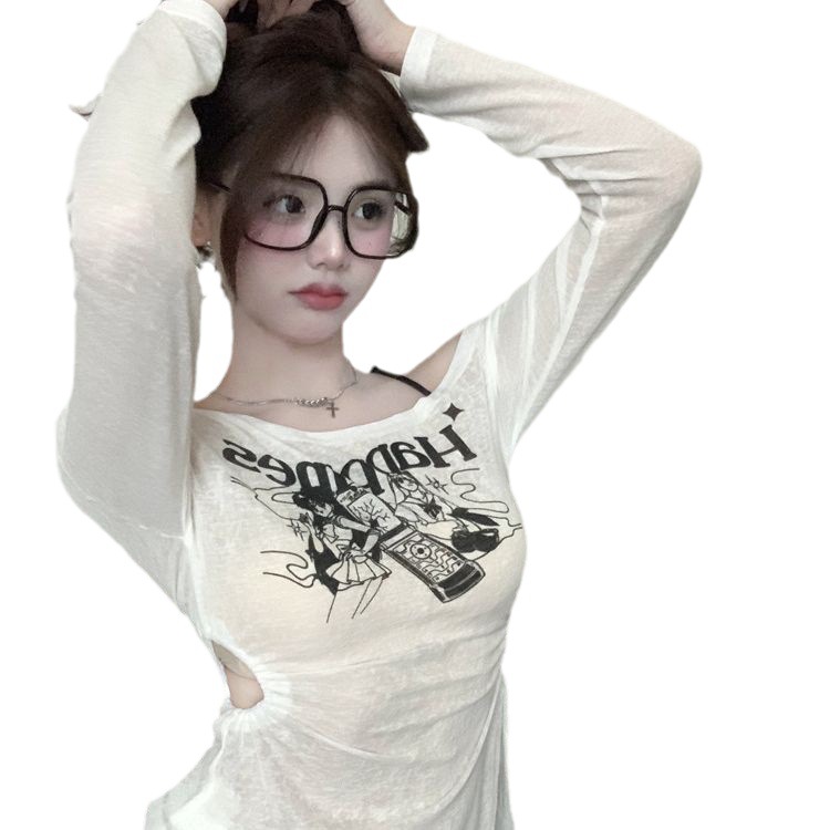 韩版甜妹镂空印花下摆开叉薄款防晒长袖T恤女夏季修身百搭上衣
