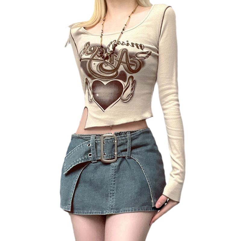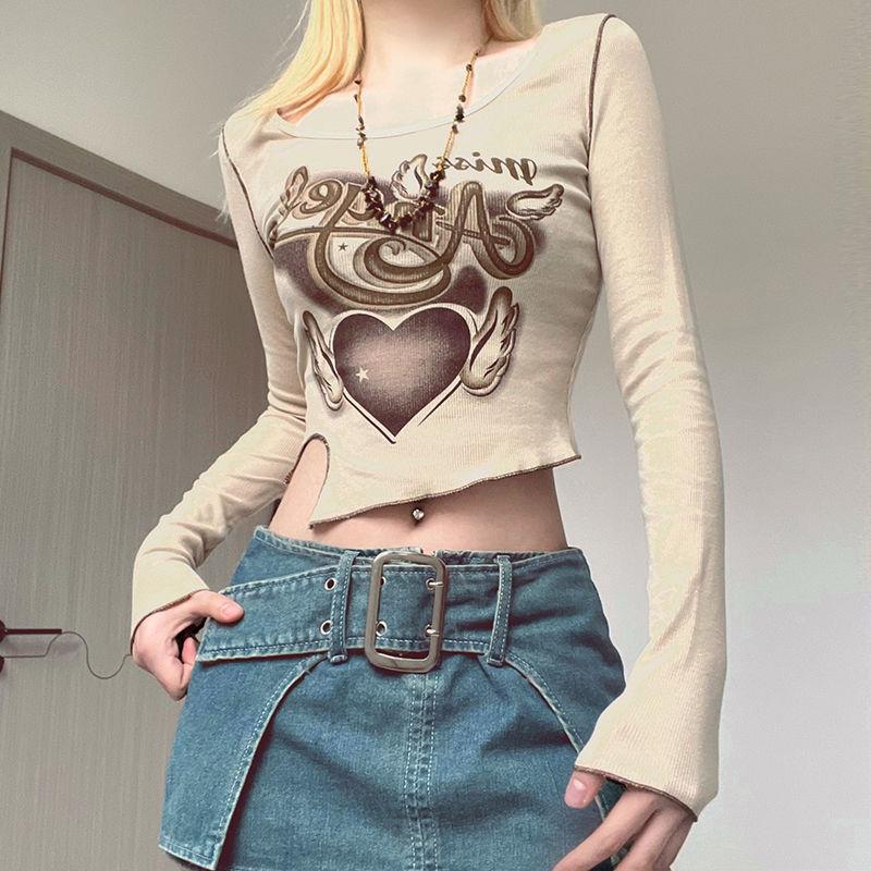 纯棉复古印花圆领不对称长袖t恤女春秋新款辣妹修身显瘦短款上衣