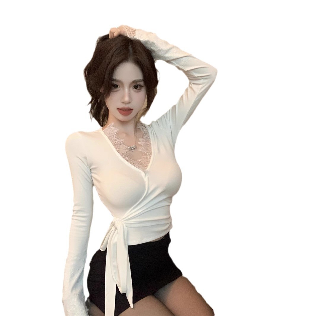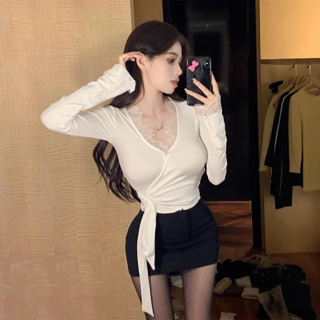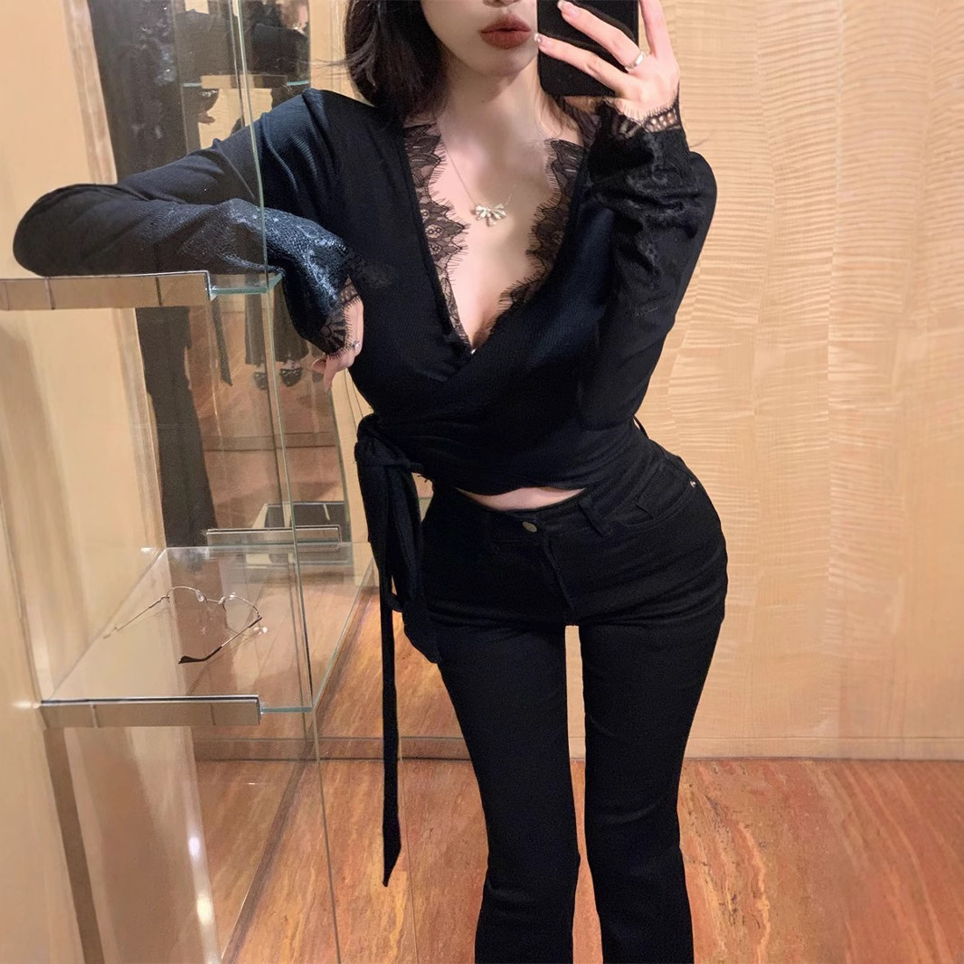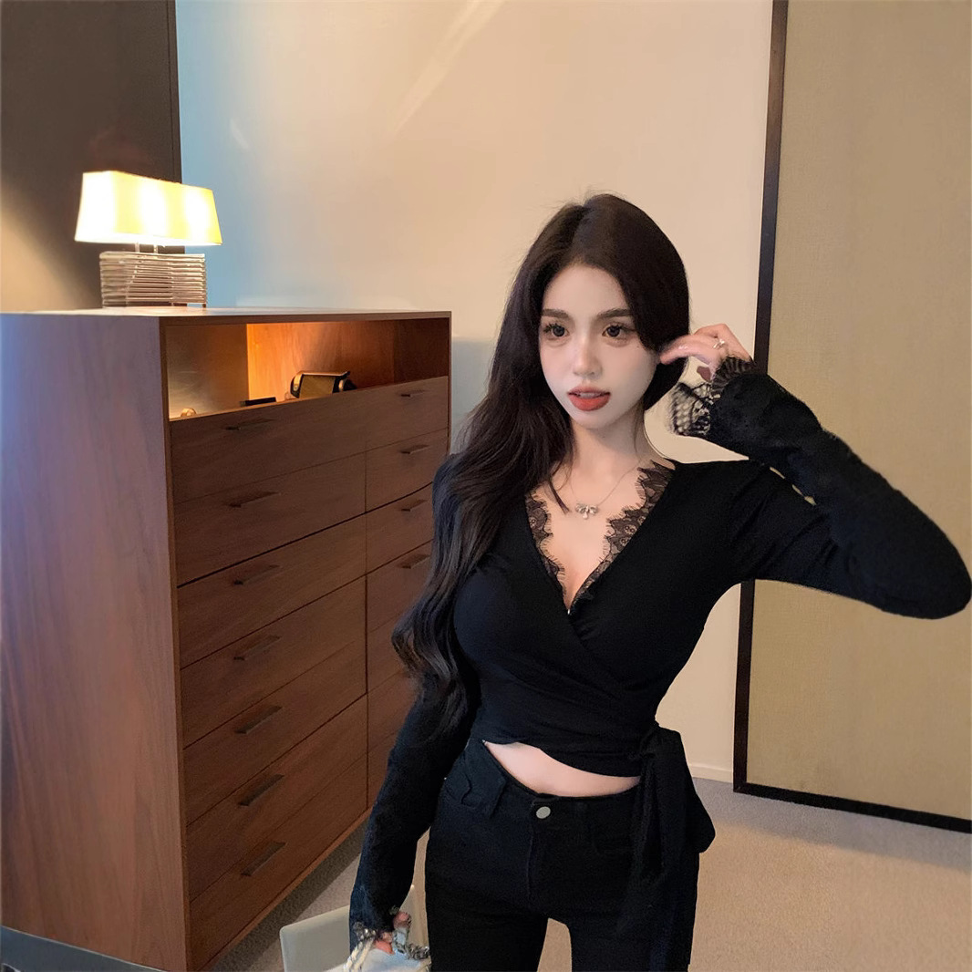 蕾丝拼接绑带长袖T恤女秋冬季性感打底衫纯欲黑色v领短款内搭上衣