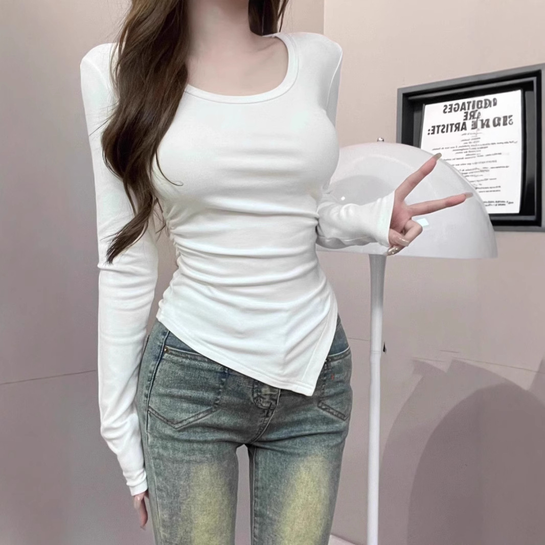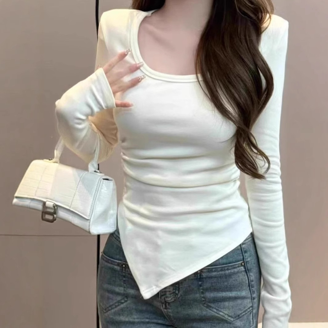 2025新款德绒辣妹U领锁骨上衣女春秋正肩内搭长袖不规则打底衫T恤