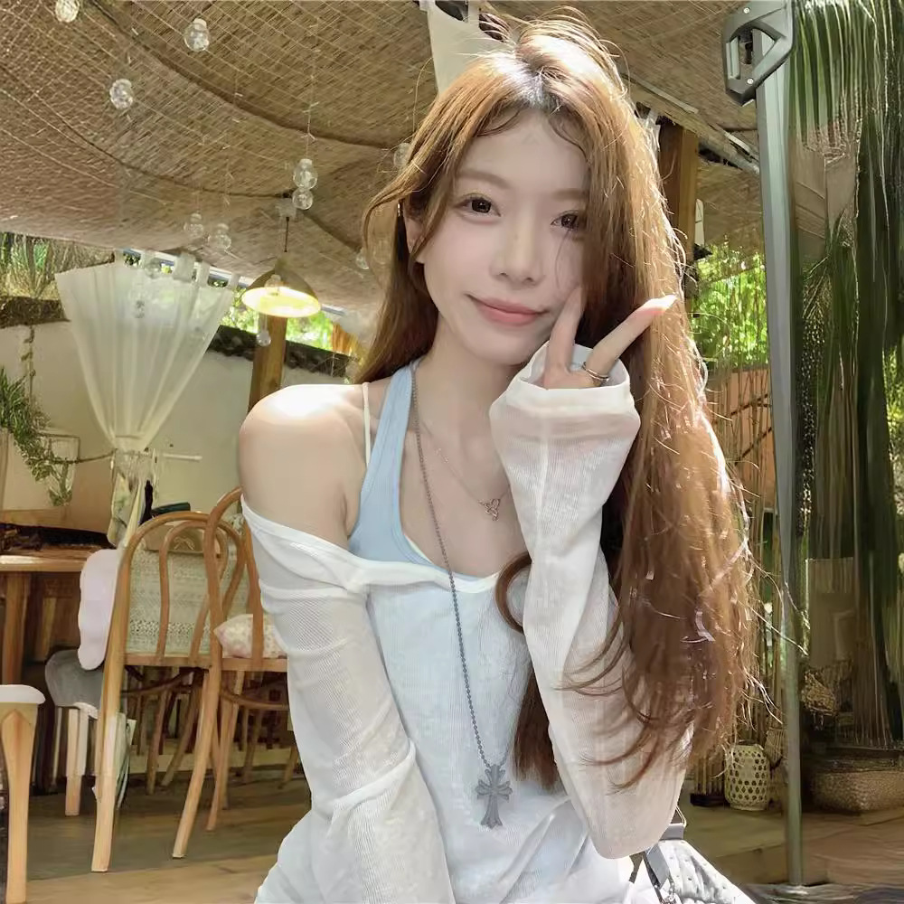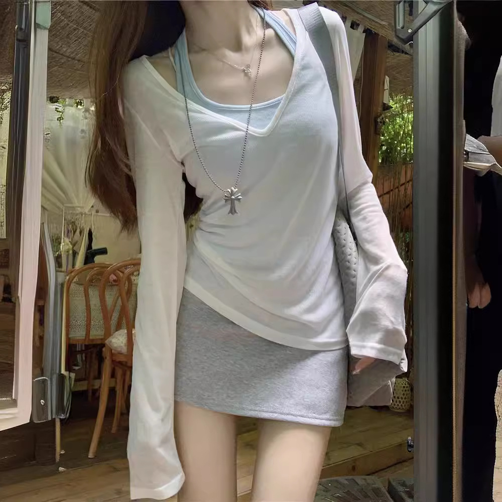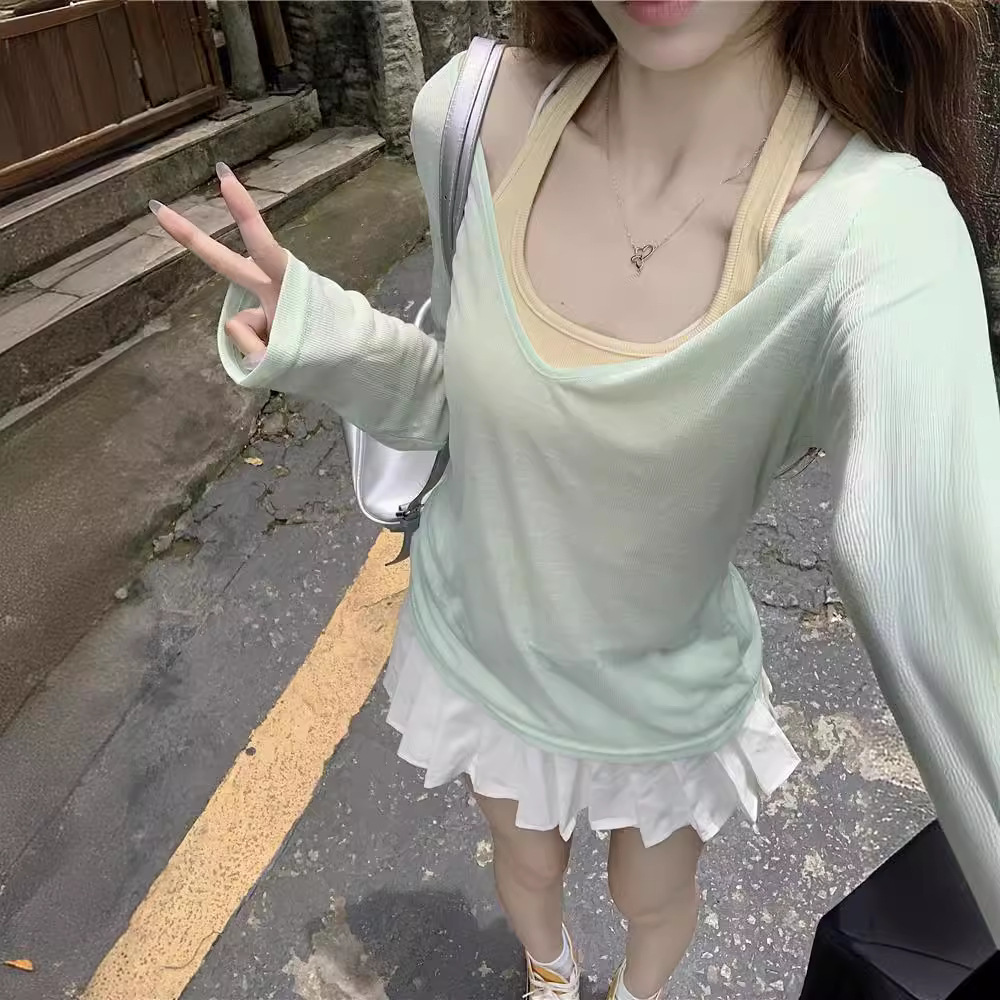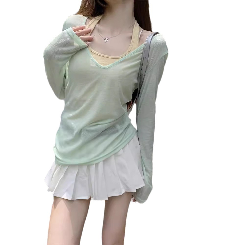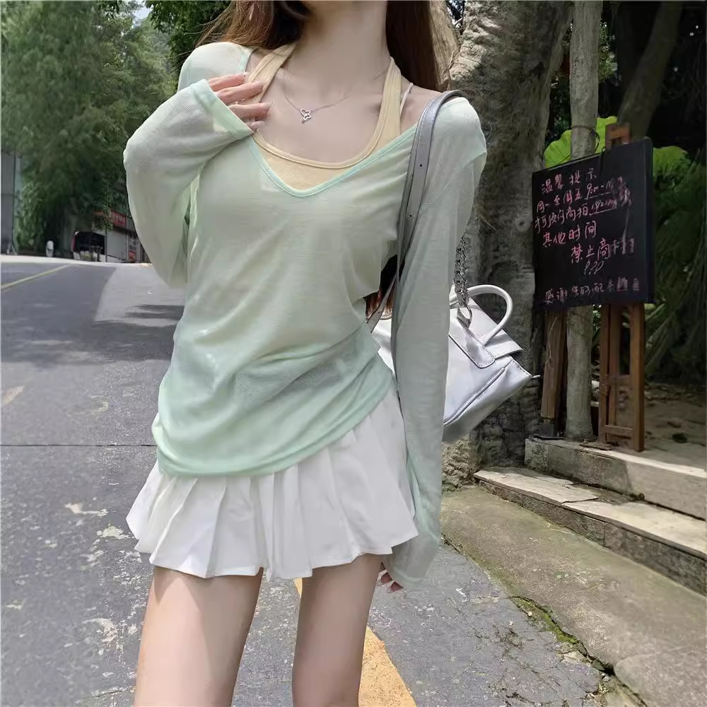 纯欲风套装V领薄款罩衫T恤女夏季小众内搭挂脖背心上衣时尚两件套