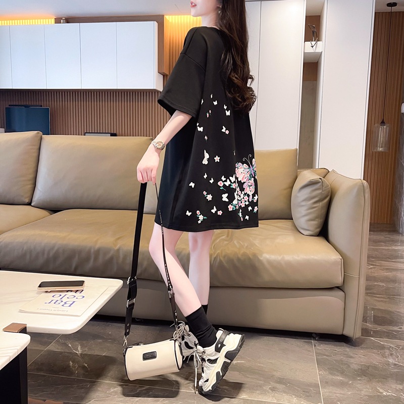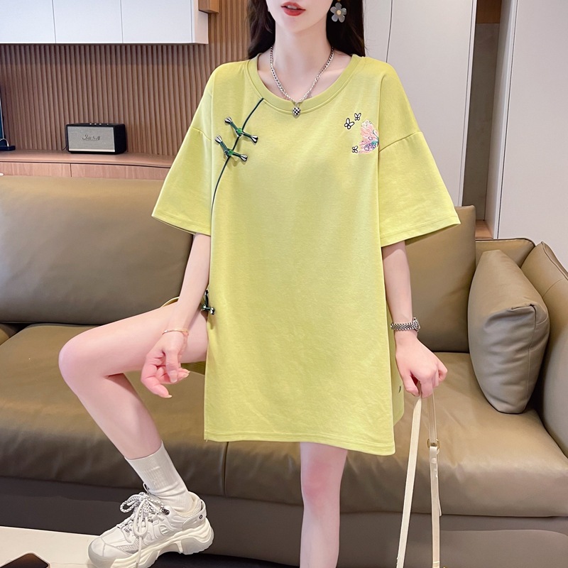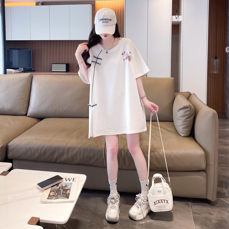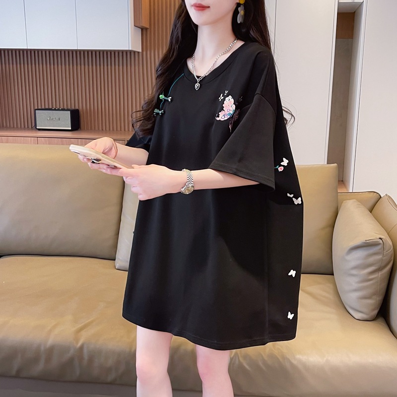 新中式国风刺绣短袖t恤女夏季2025年新款大码宽松中长款洋气上衣