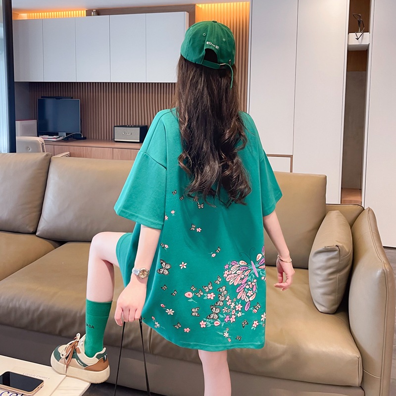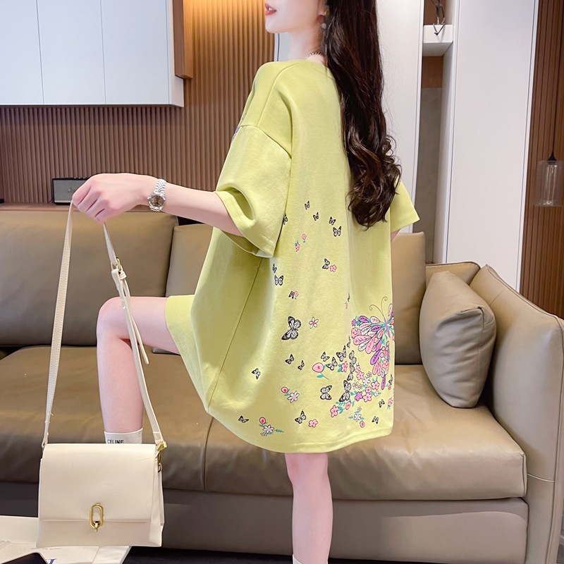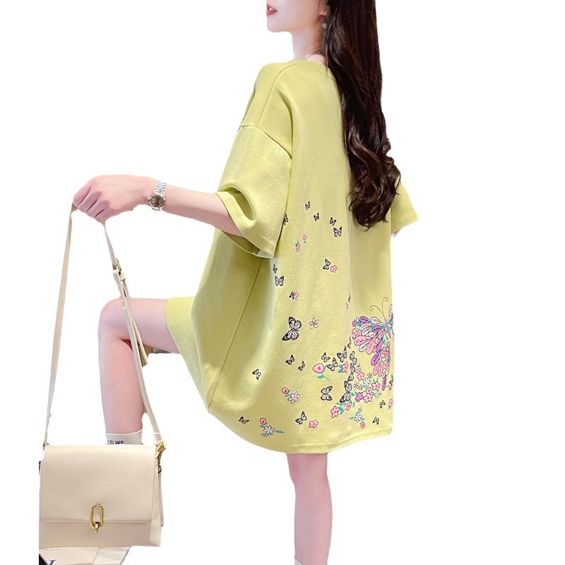 慵懒男友风宽松深V领半袖T恤女夏季休闲中长款大版百搭纯色上衣潮