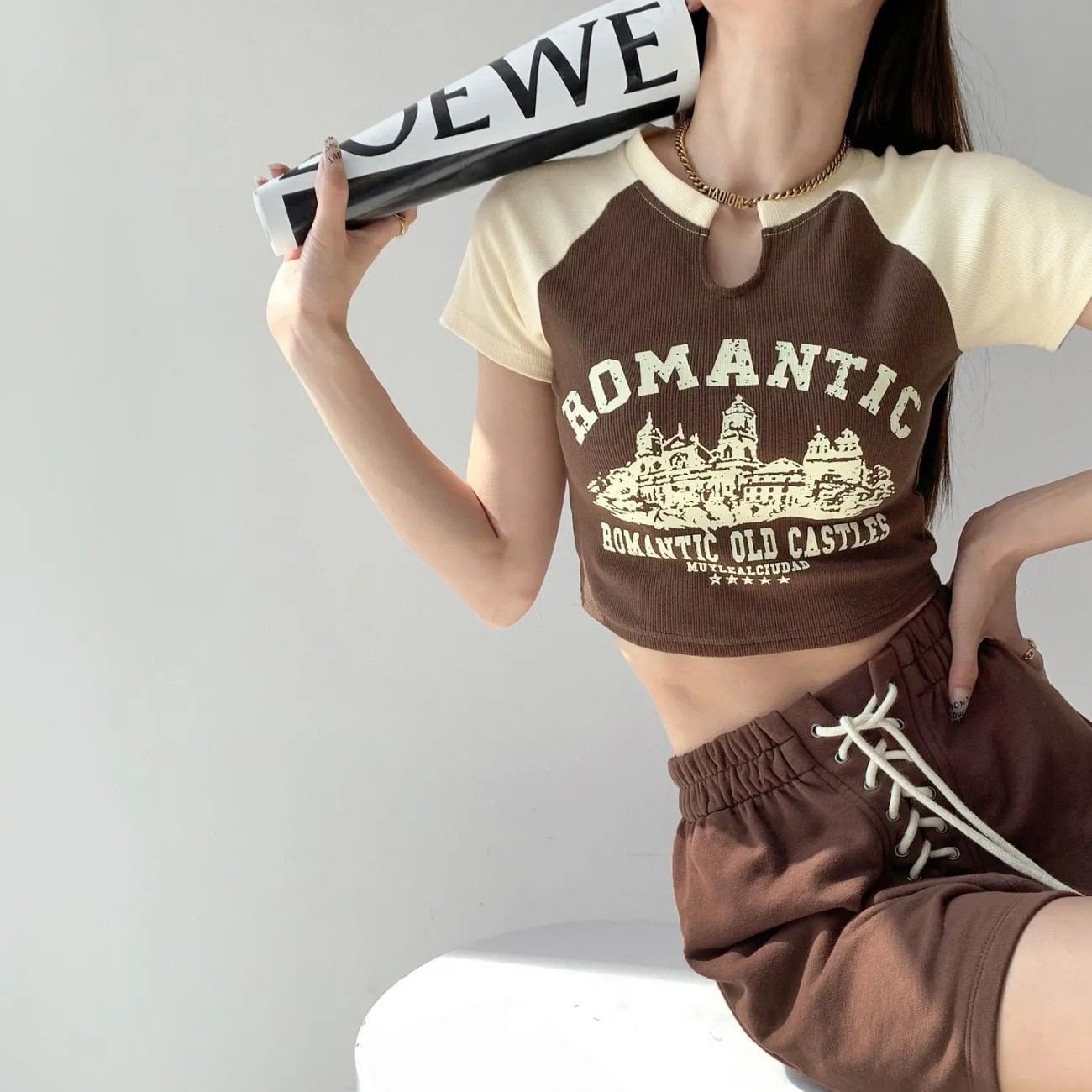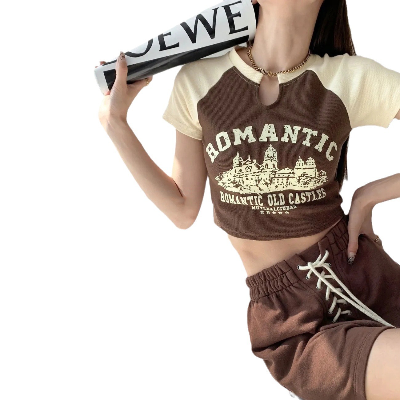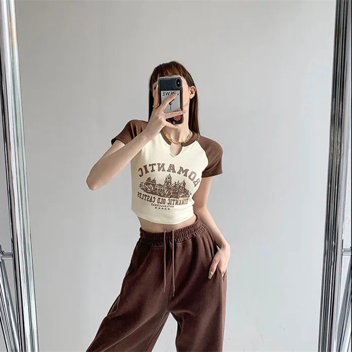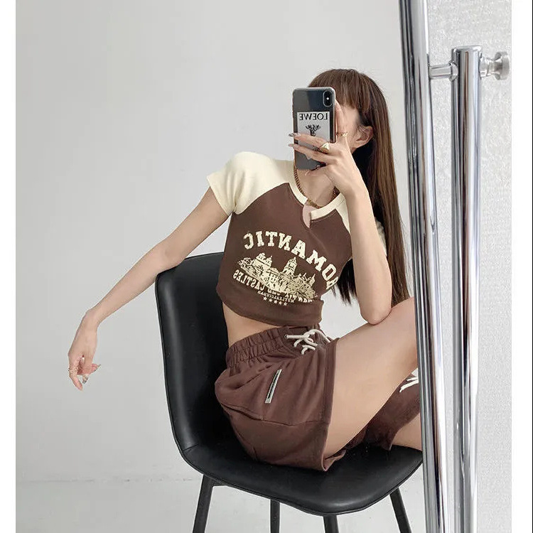 辣妹正肩短袖T恤女夏季2025甜辣美式露脐设计感小众独特短款上衣