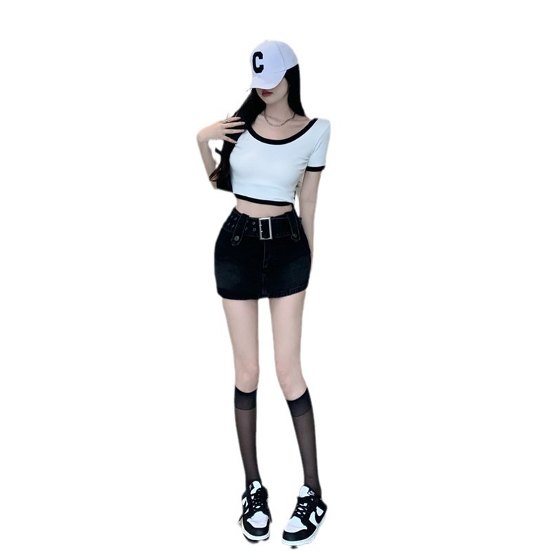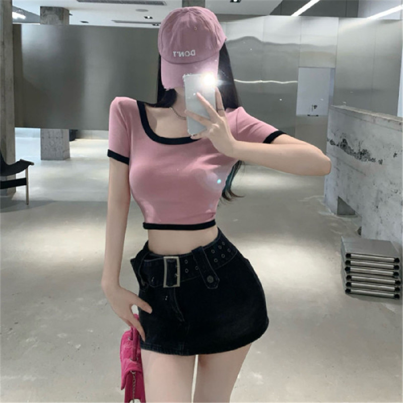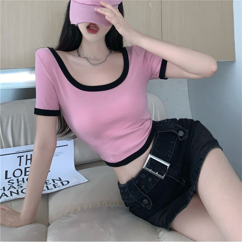 纯欲辣妹风大圆领显瘦撞色短款t恤女露脐性感多巴胺穿搭上衣欧货