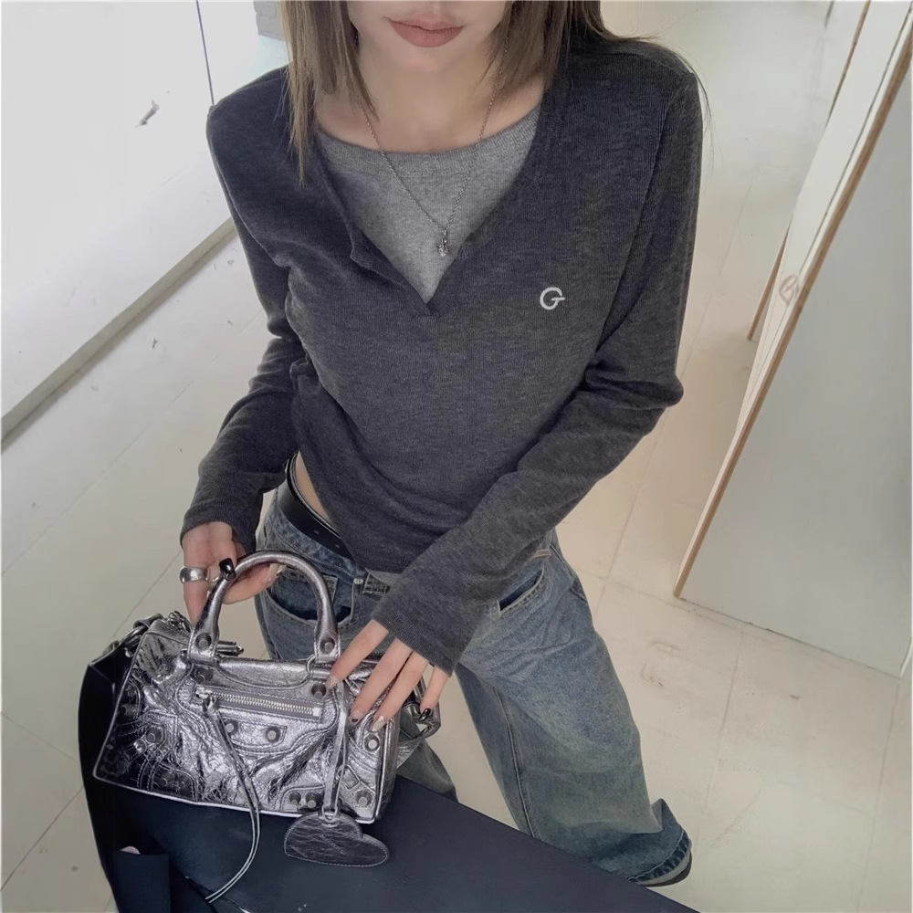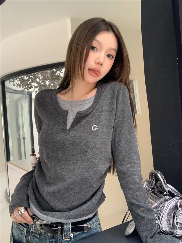 德绒别致假两件小众拼接长袖T恤女设计感修身打底衫正肩上衣欧货