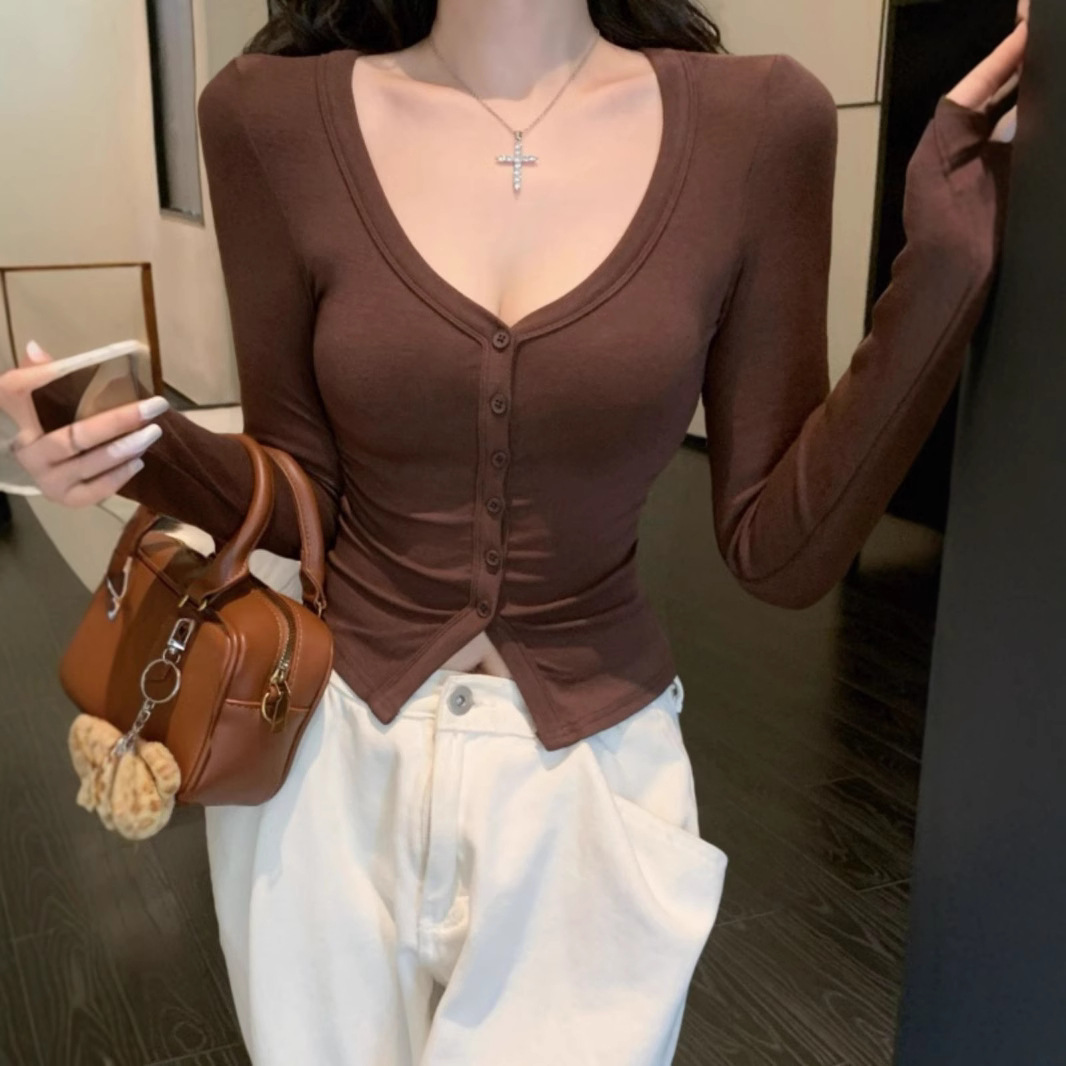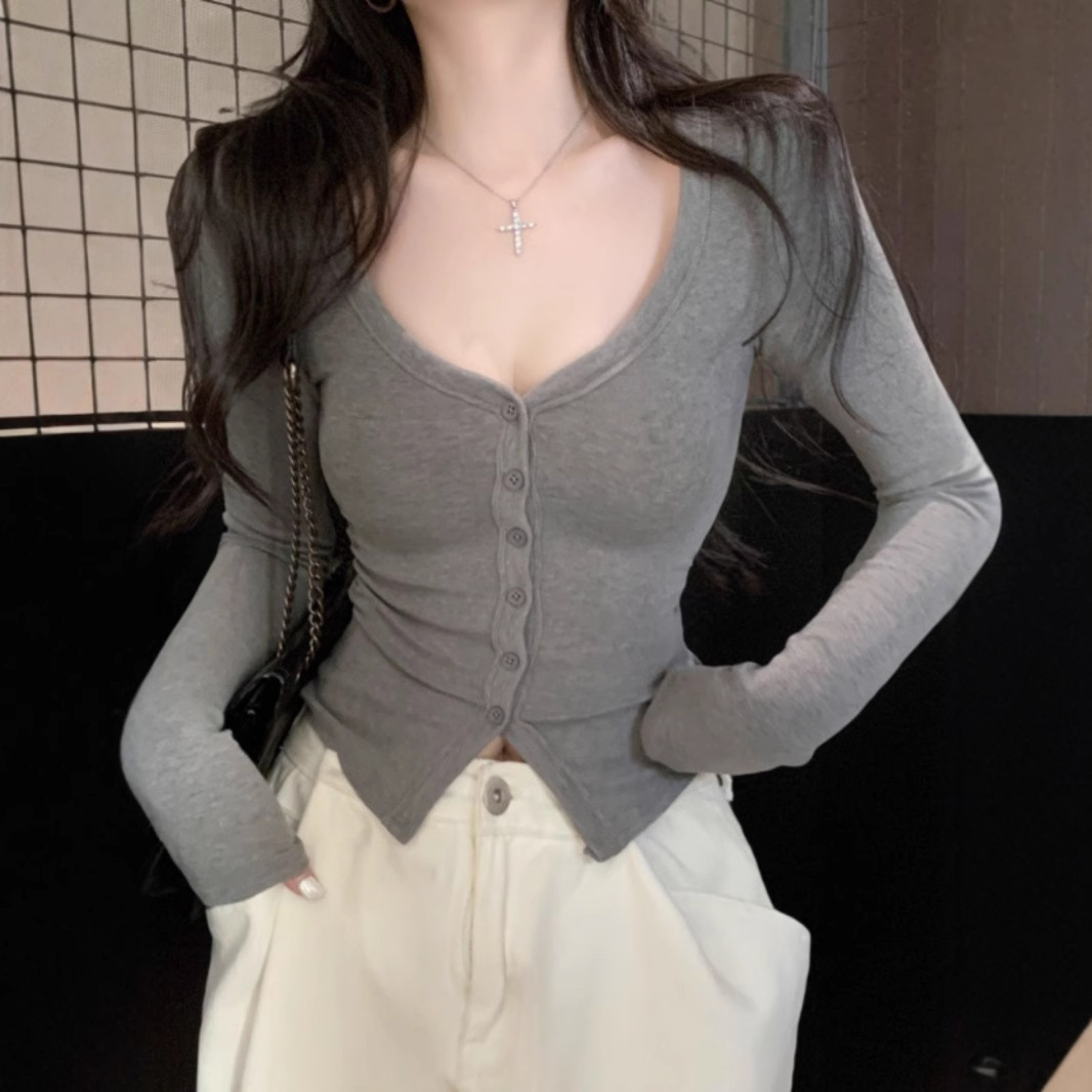辣妹风v领长袖T恤女洋气时髦修身紧身内搭显瘦打底开衫短款上衣