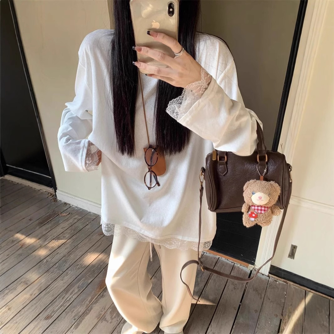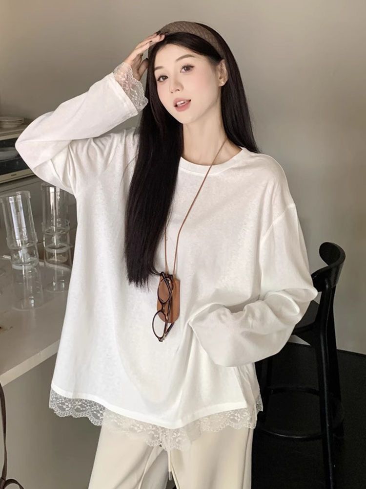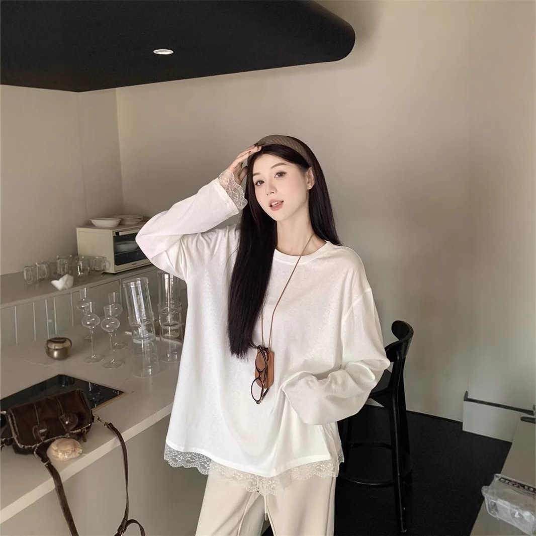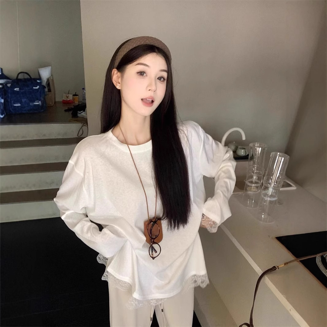 德绒中长款秋季单穿内搭蕾丝拼接宽松白色T恤女长袖打底衫内搭潮