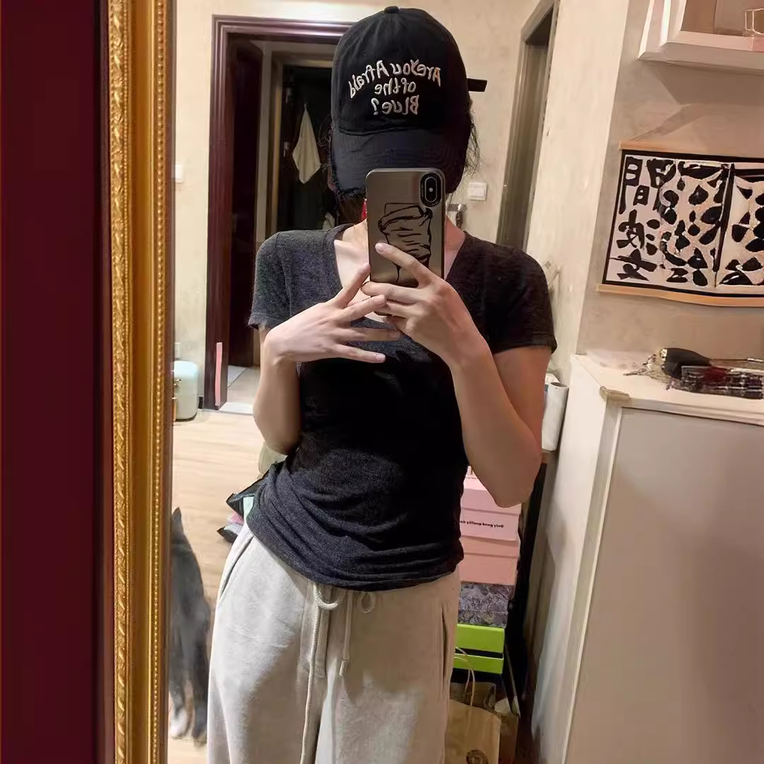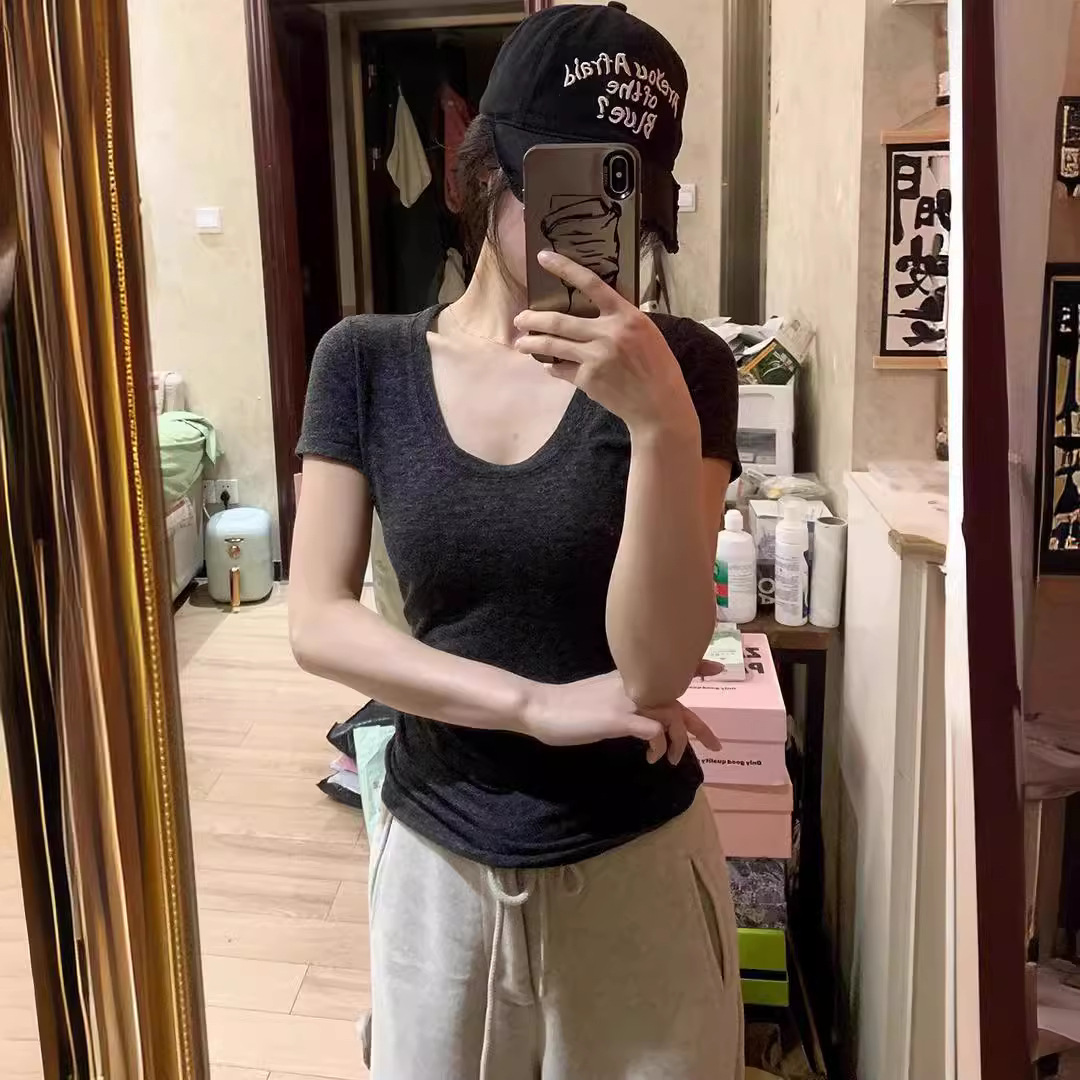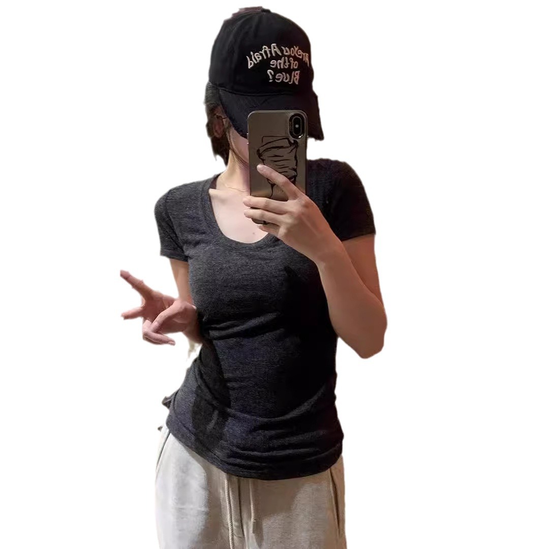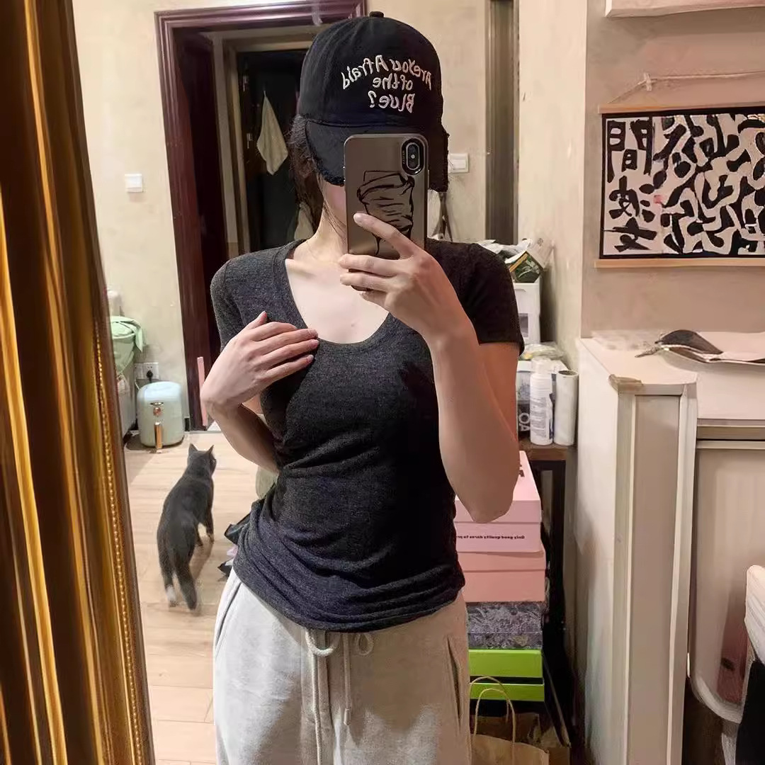 美式复古U领正肩短袖T恤女夏2025新款设计感小众修身短款上衣