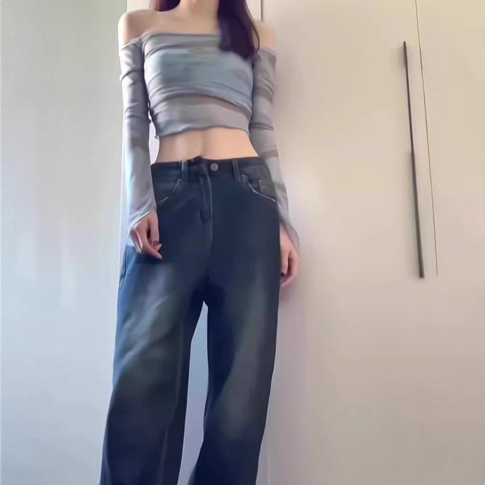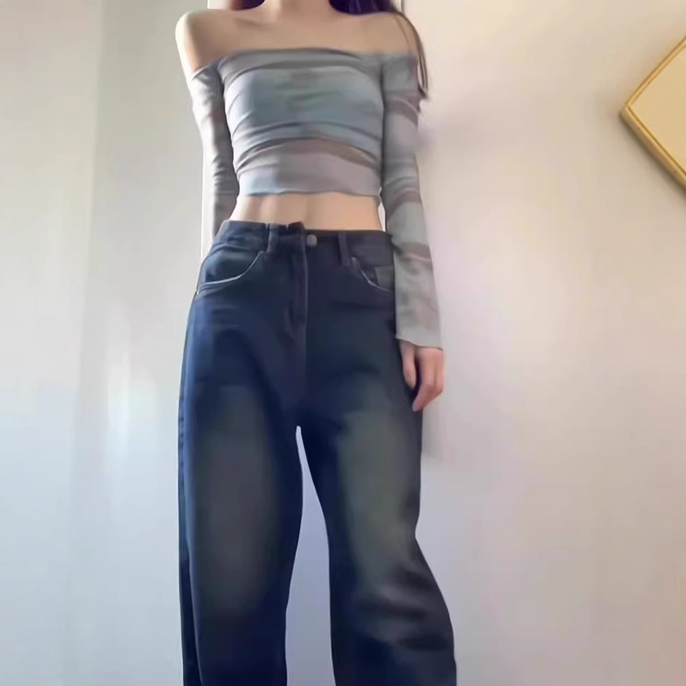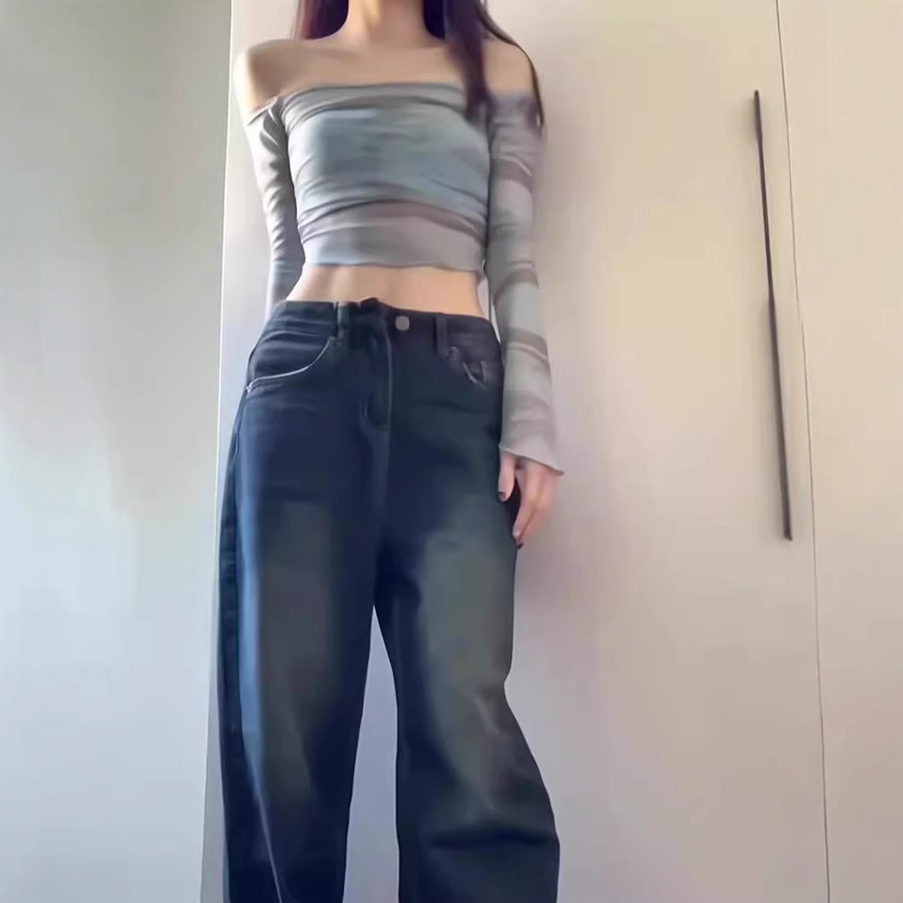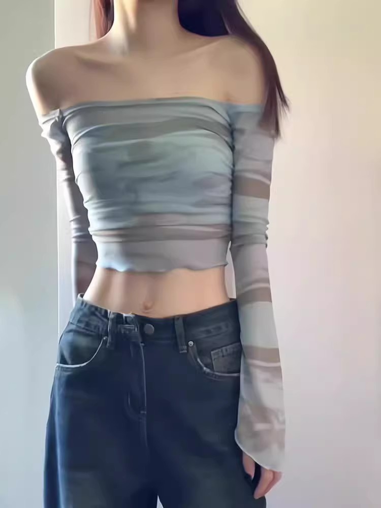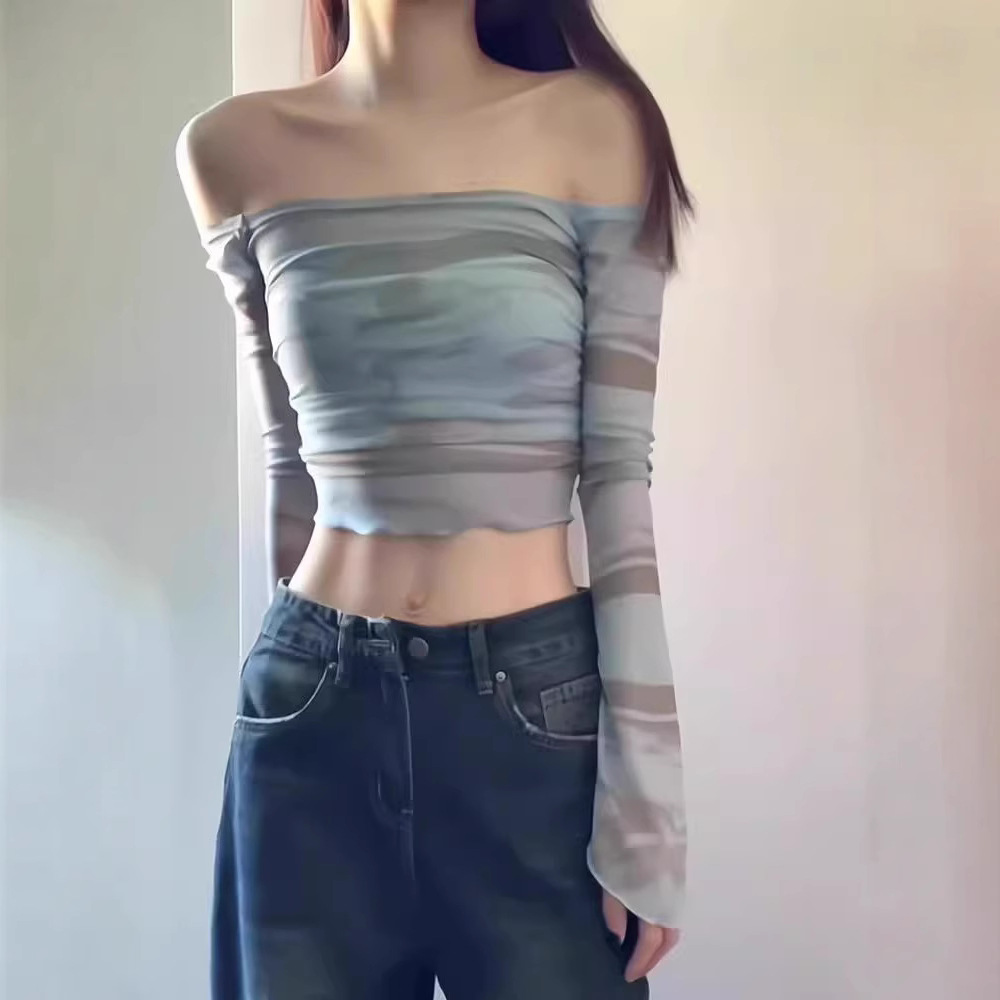 晕染一字肩露肩性感欧美货设计感短款t恤女新款爆款修身抹胸上衣