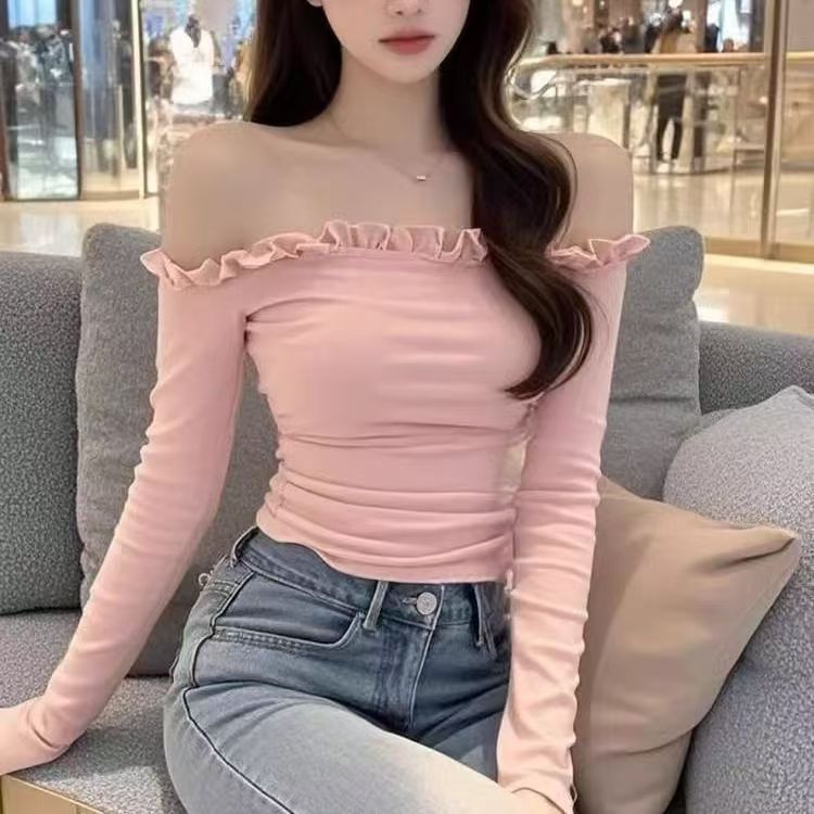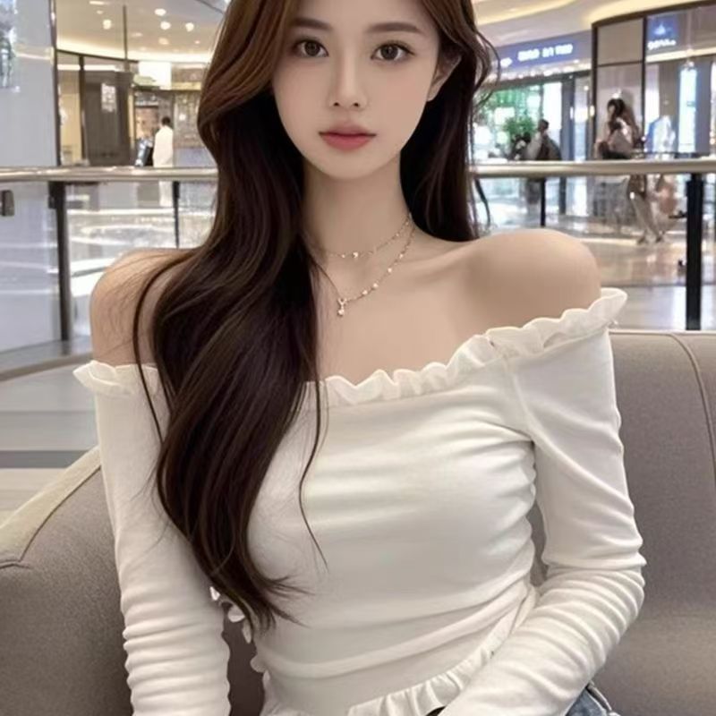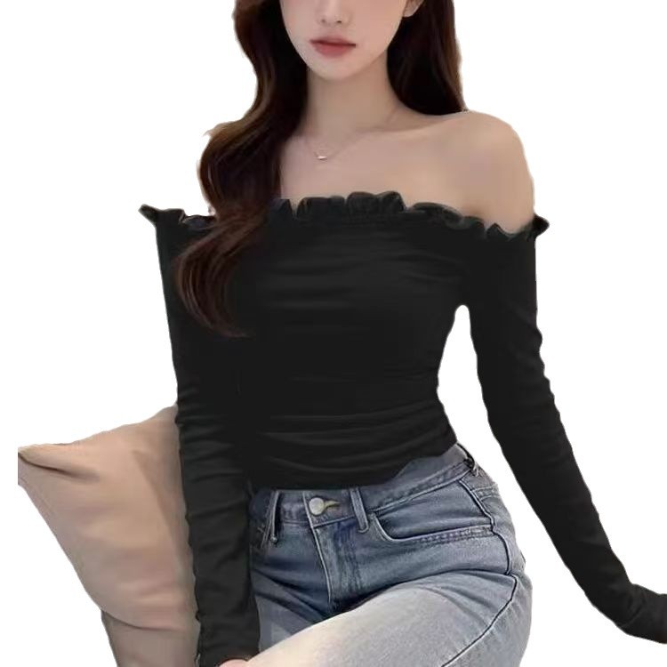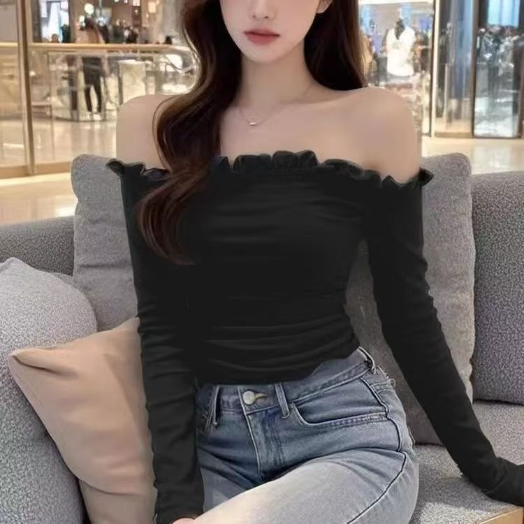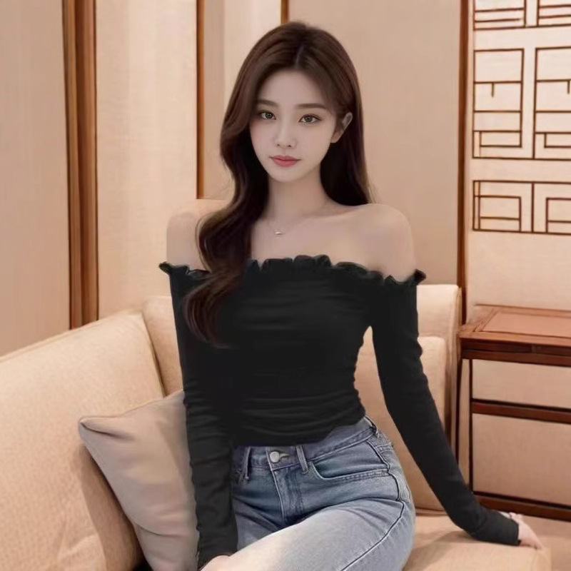 纯欲辣妹风一字肩木耳边长袖t恤女修身显瘦短款内搭打底衫上衣潮