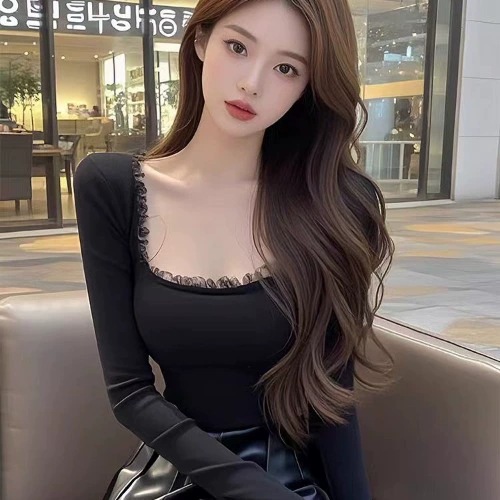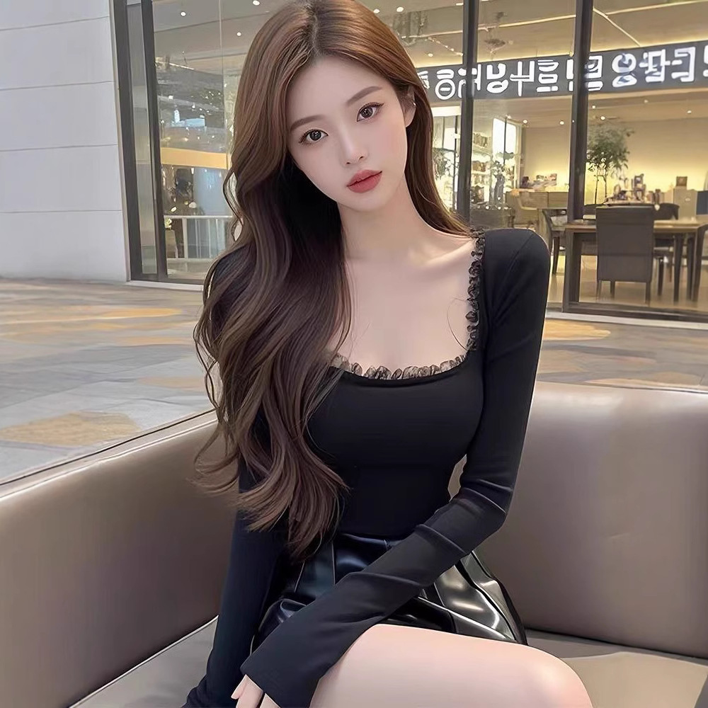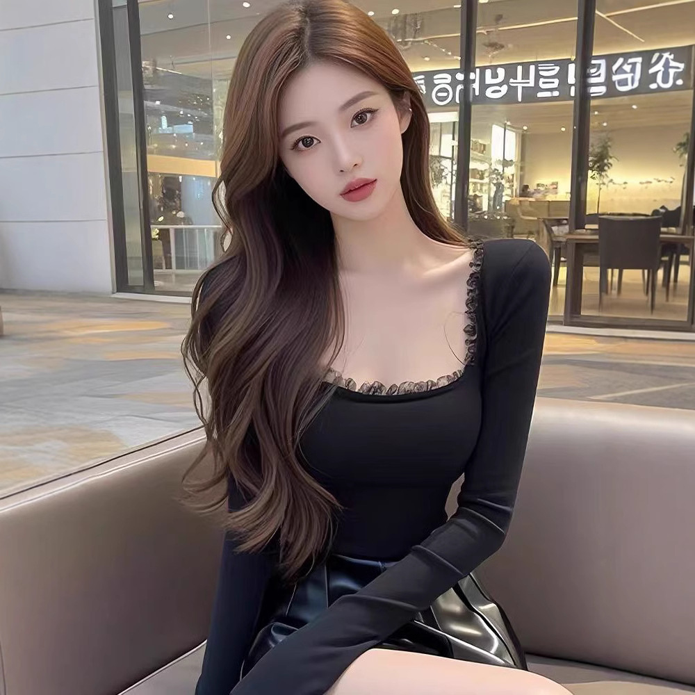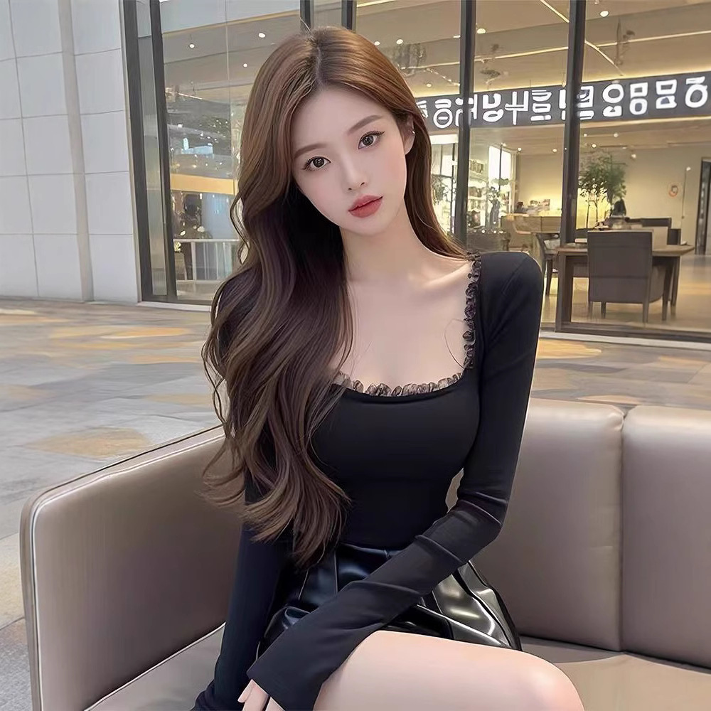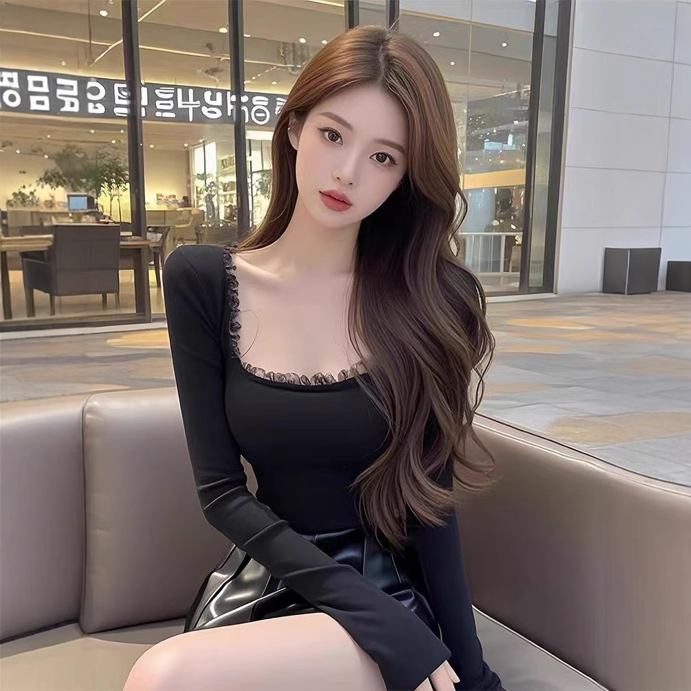 德绒纯欲辣妹方领蕾丝花边修身打底衫女设计感小众绝美内搭上衣潮
