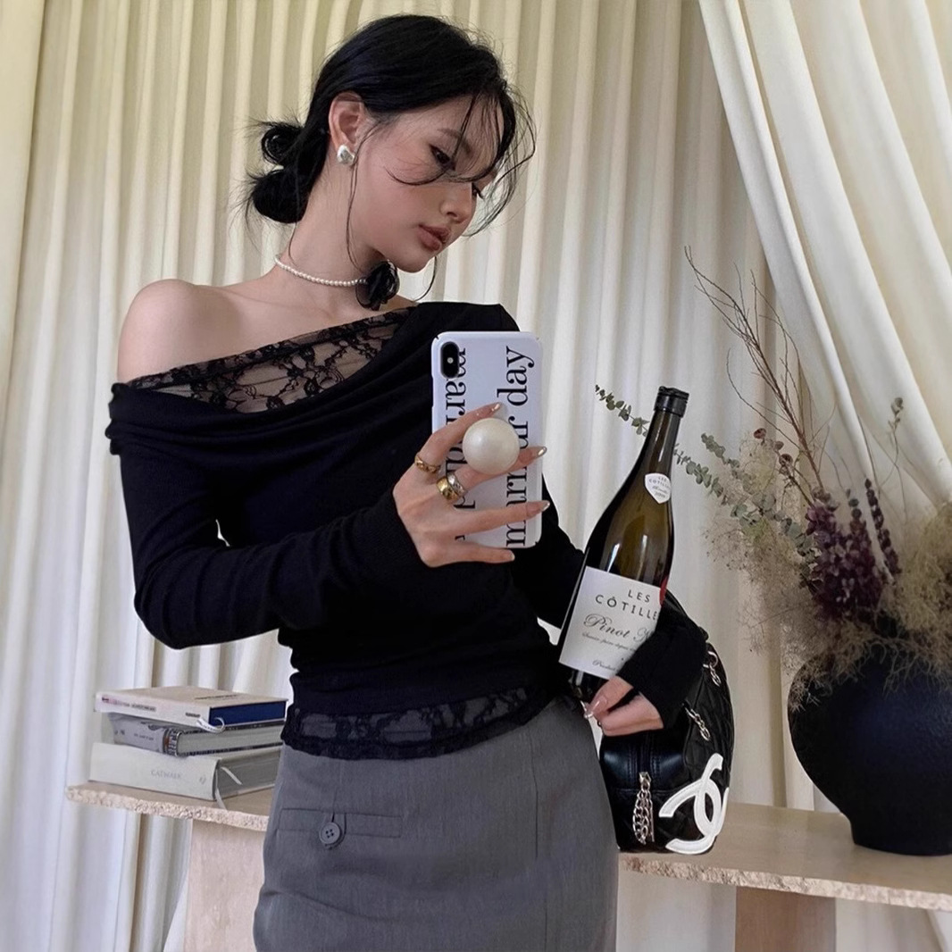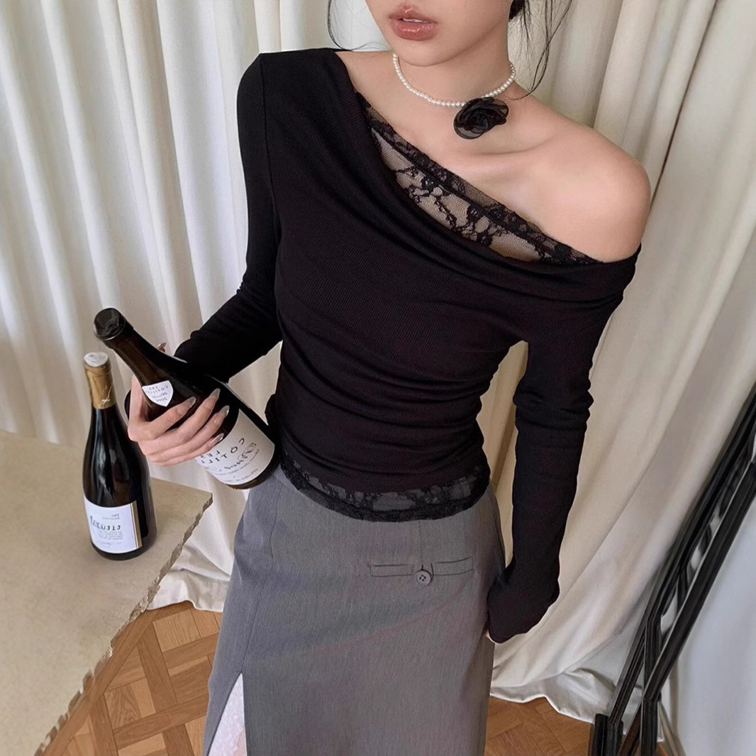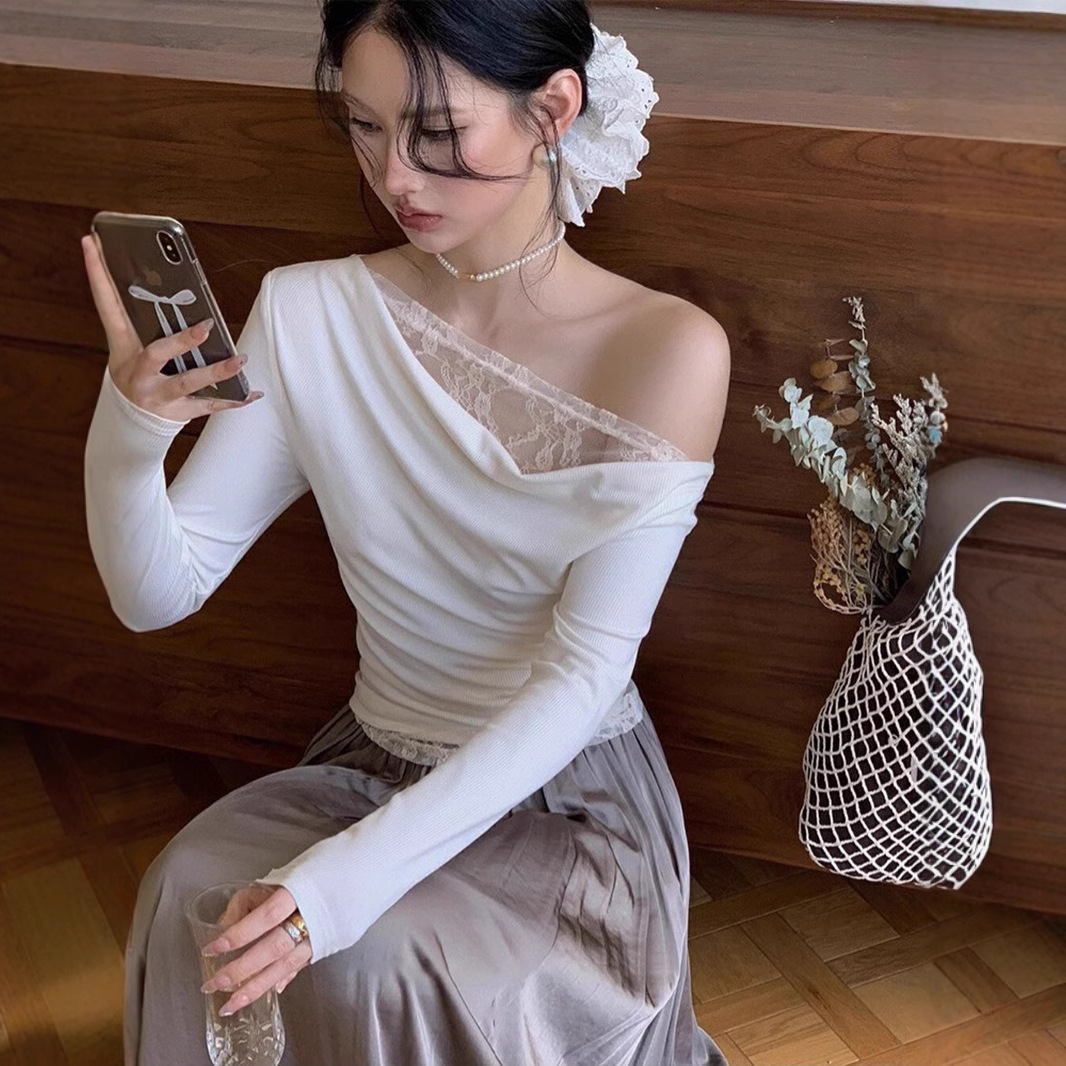 2025新款蕾丝拼接斜肩打底衫T恤女秋新款设计感显瘦内搭短款上衣