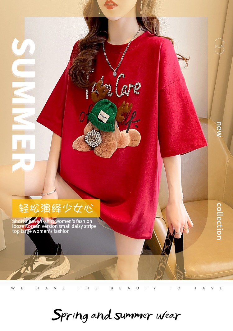 爆款中长款短袖t恤女宽松洋气重工钉珠立体卡通小众设计感欧货