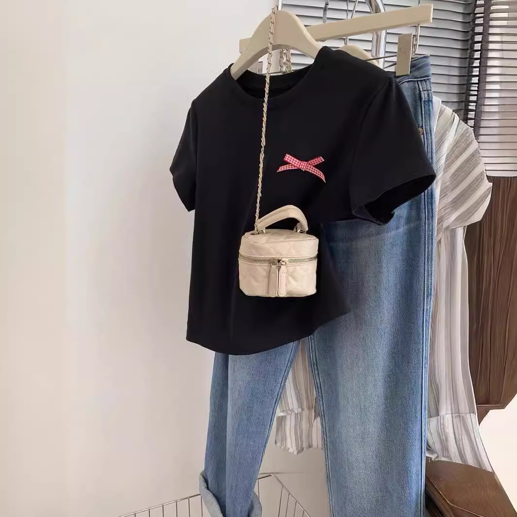 灰色蝴蝶结正肩短袖t恤女夏季新款胖妹妹大码设计感宽松上衣