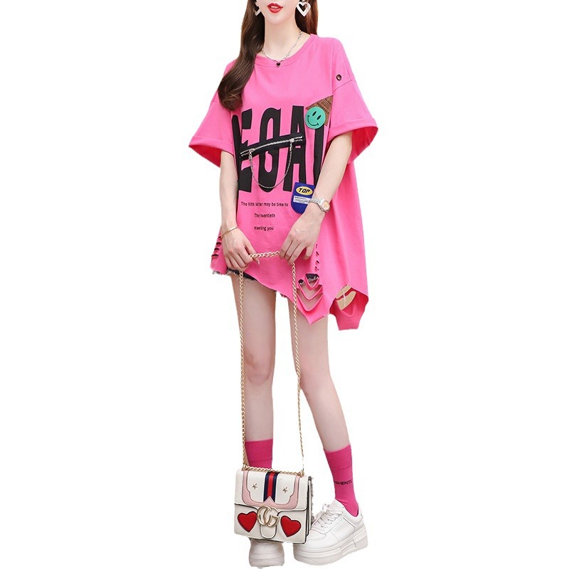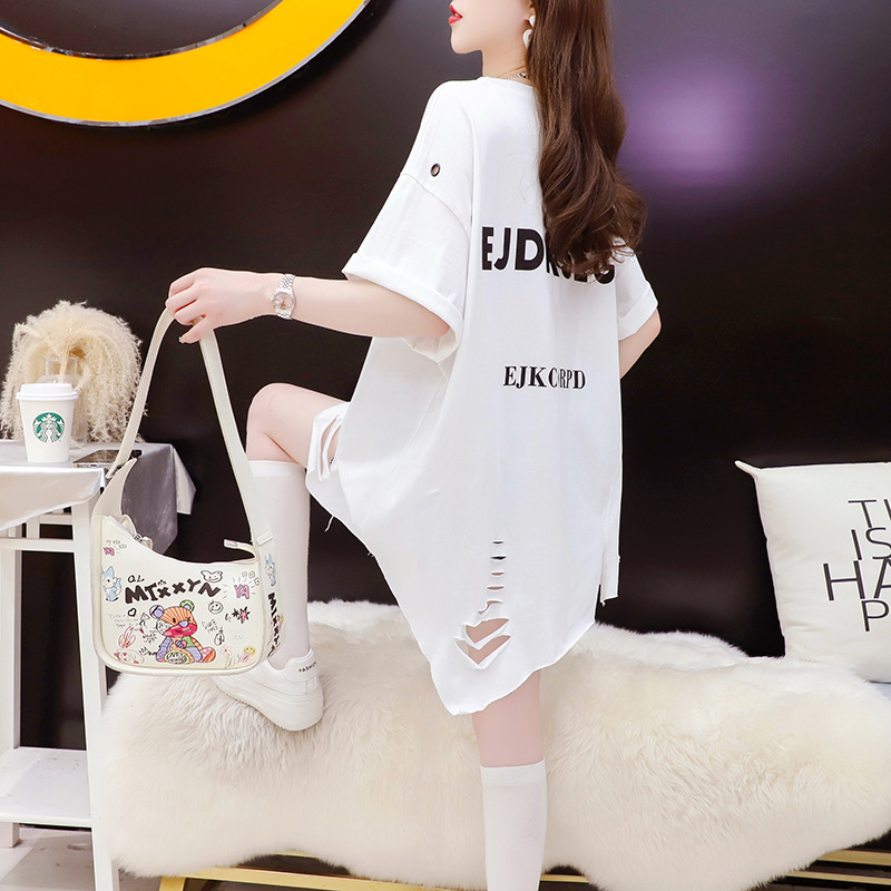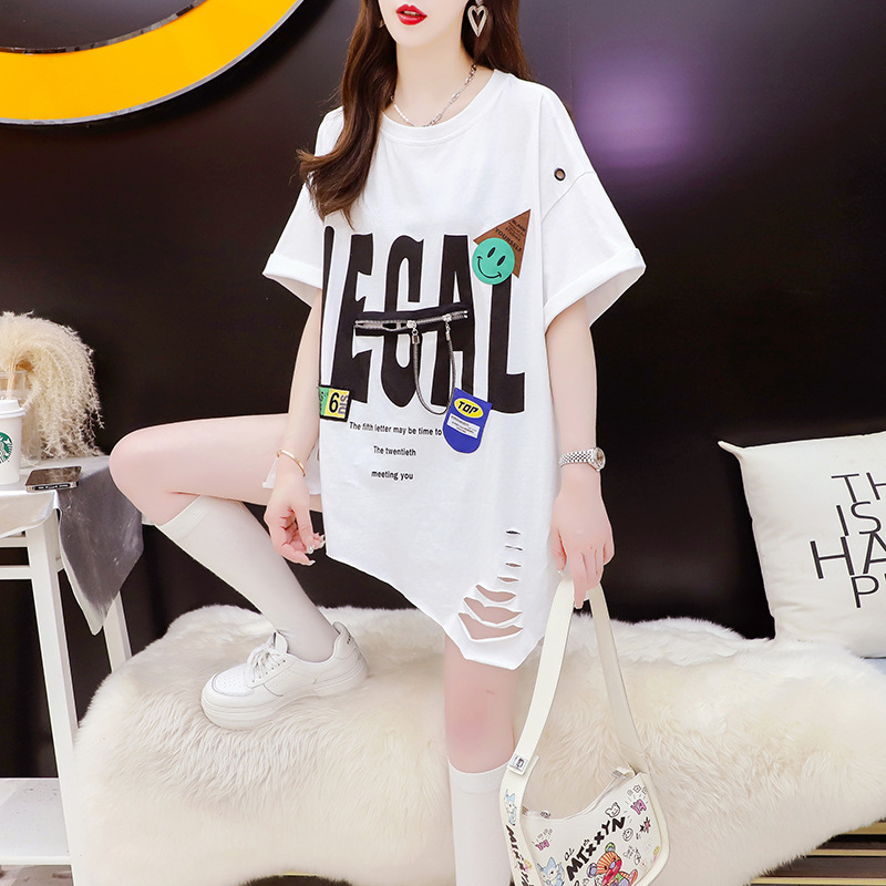 破洞风个性棉质后包领大码240斤重工破洞拼接设计感短袖t恤