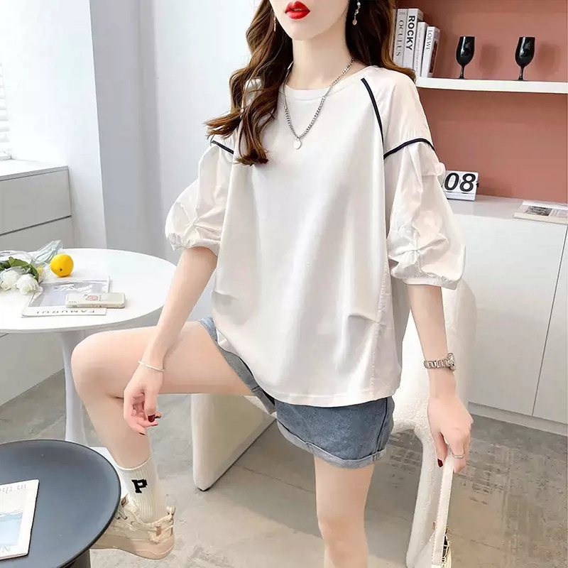 纯全棉夏季纯色泡泡袖短袖圆领T恤女学生小众设计感夏装上衣