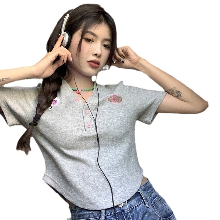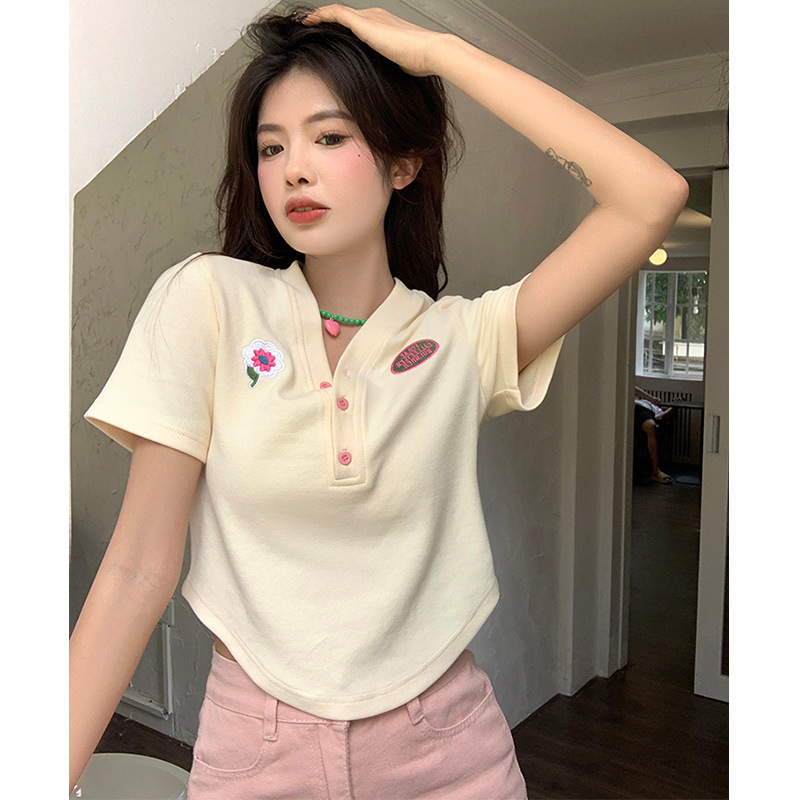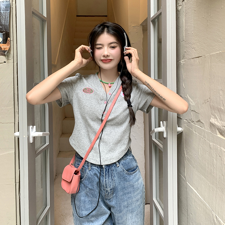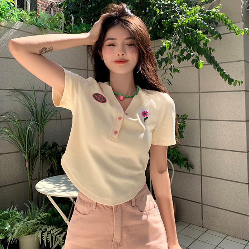 爆款纯棉短款小个子夏季新款修身V领刺绣短袖t恤女别致小众设计感