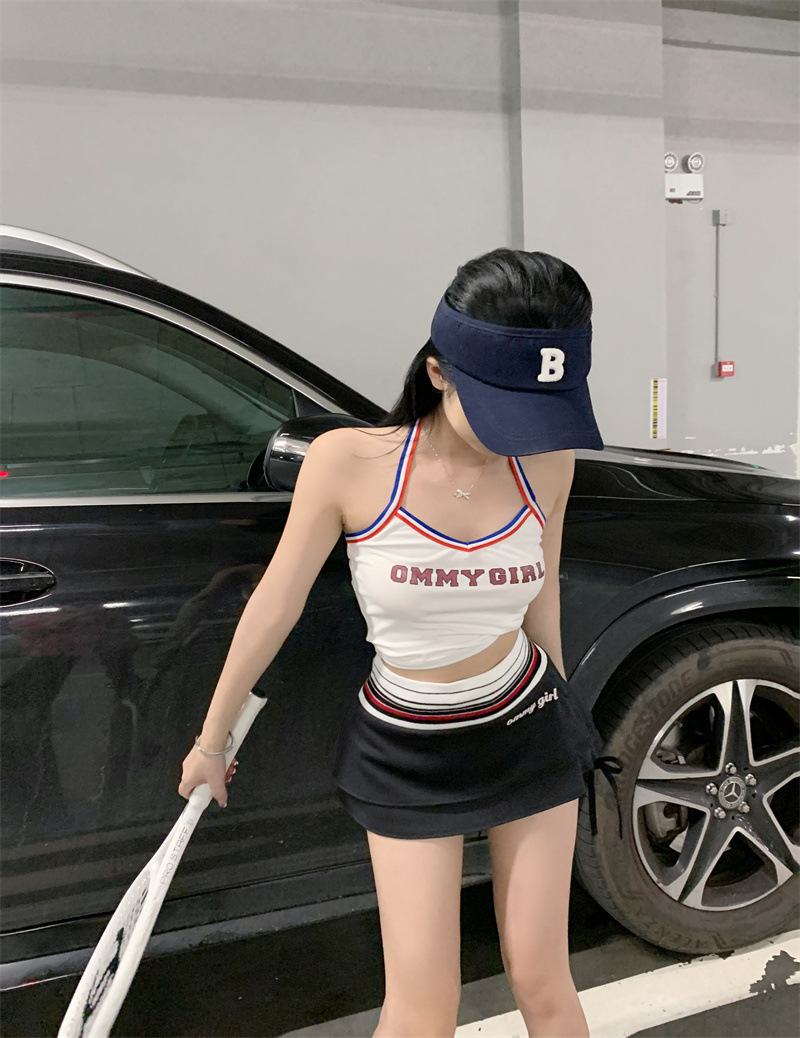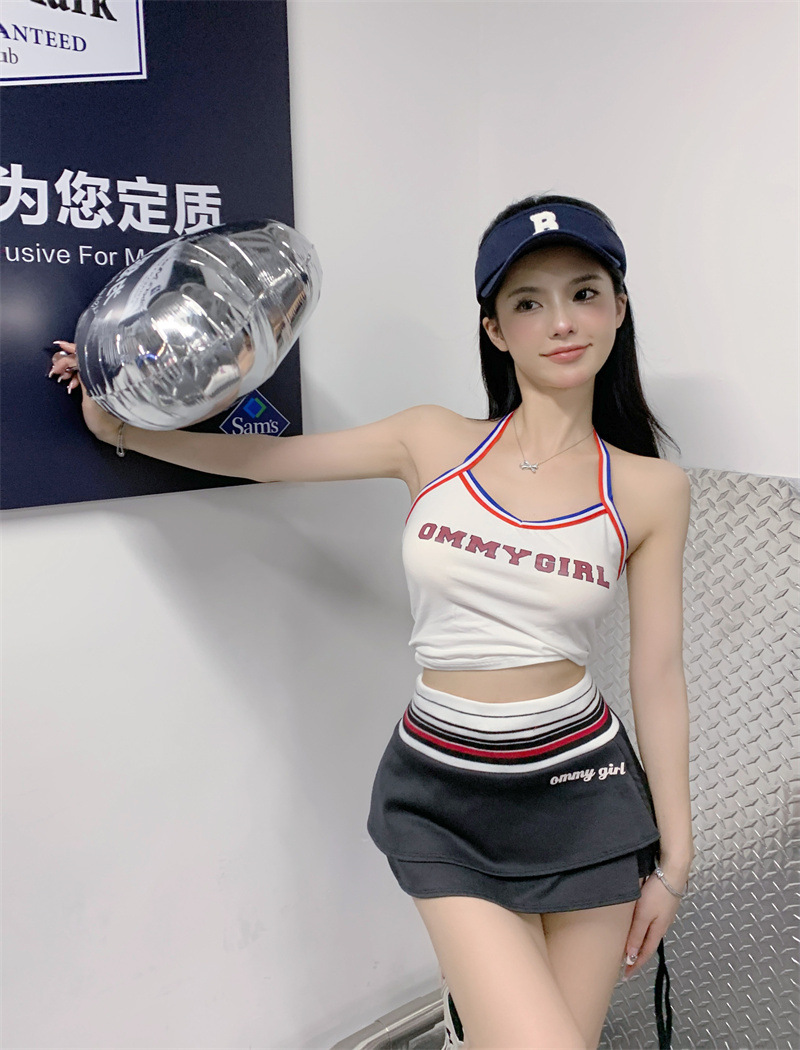 甜酷辣妹可爱少女挂脖吊带背心外搭叠穿低腰超短裙套装显瘦半身裙