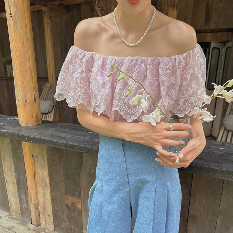 诠释美 NEW OPEN法式甜美一字肩针织衫女夏季蕾丝荷叶边上衣82712