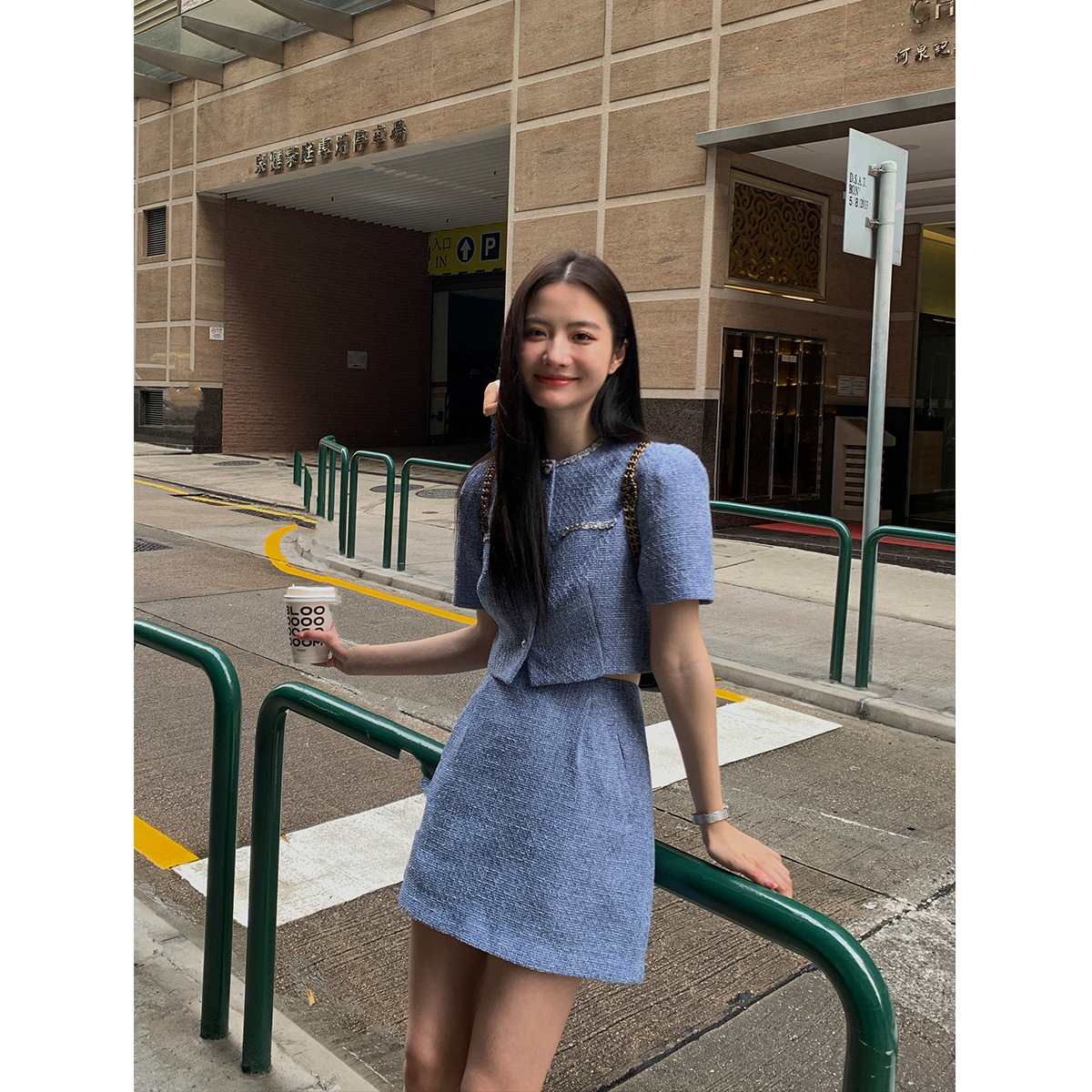 诠释美NEW OPEN时尚套装女夏小香风短款开衫半裙两件套82378