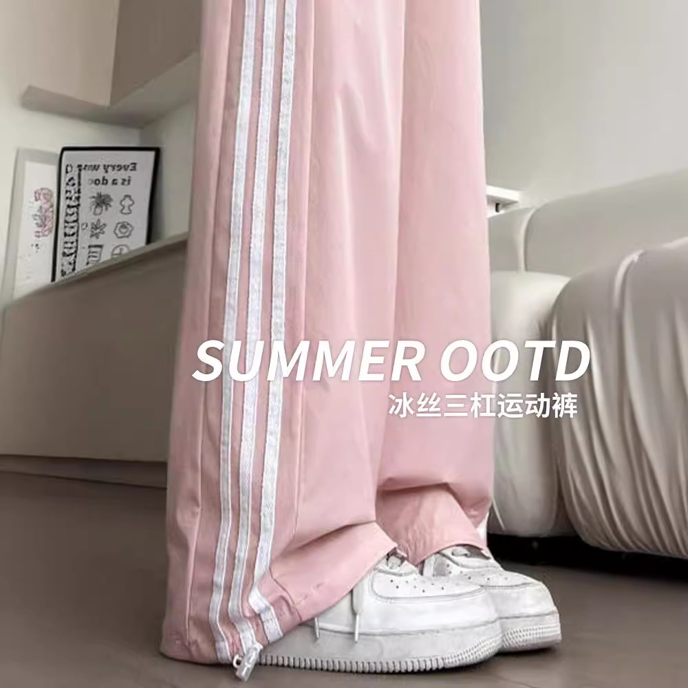 粉色冰丝运动裤女夏季薄款高腰直筒阔腿裤休闲宽松束脚速干卫裤子