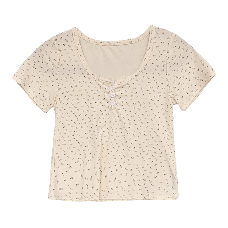 高弹坑条碎花短袖正肩短款上衣女夏季修身设计感小众百搭t恤小个