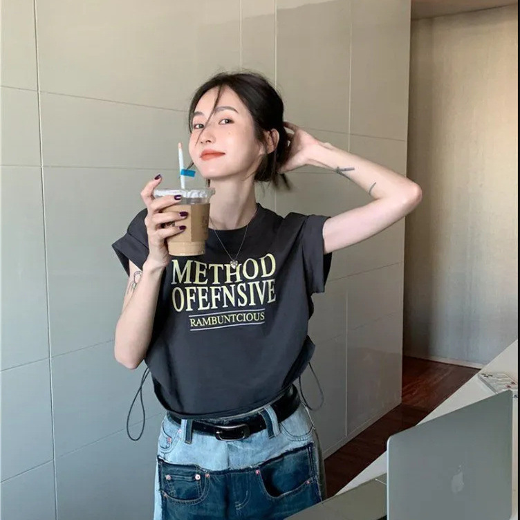 美式复古短袖女夏季收腰短款露脐下摆抽绳小个子抖音爆款配裤上衣