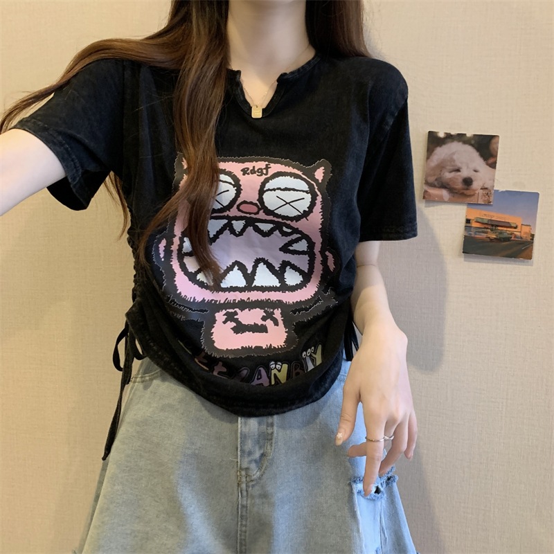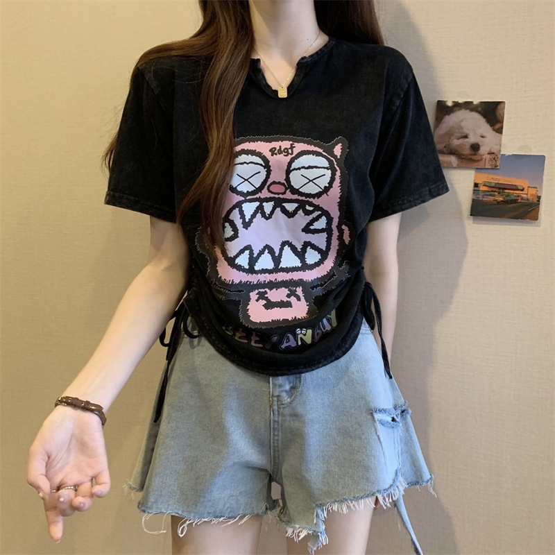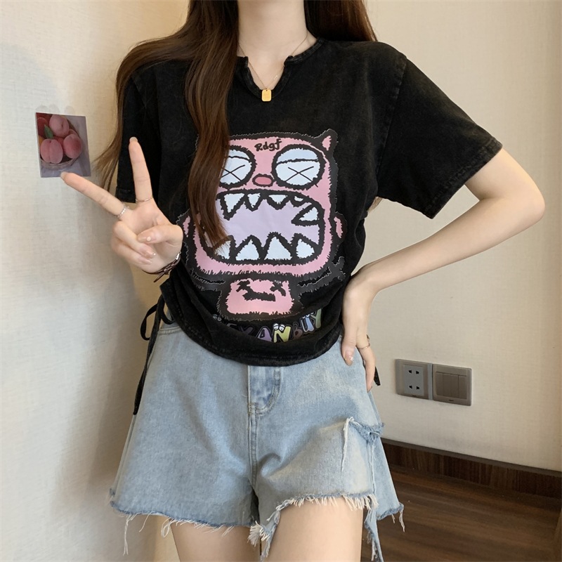 纯棉洗水牛仔短款正肩短袖T恤女夏装小个子显瘦打底衫设计感